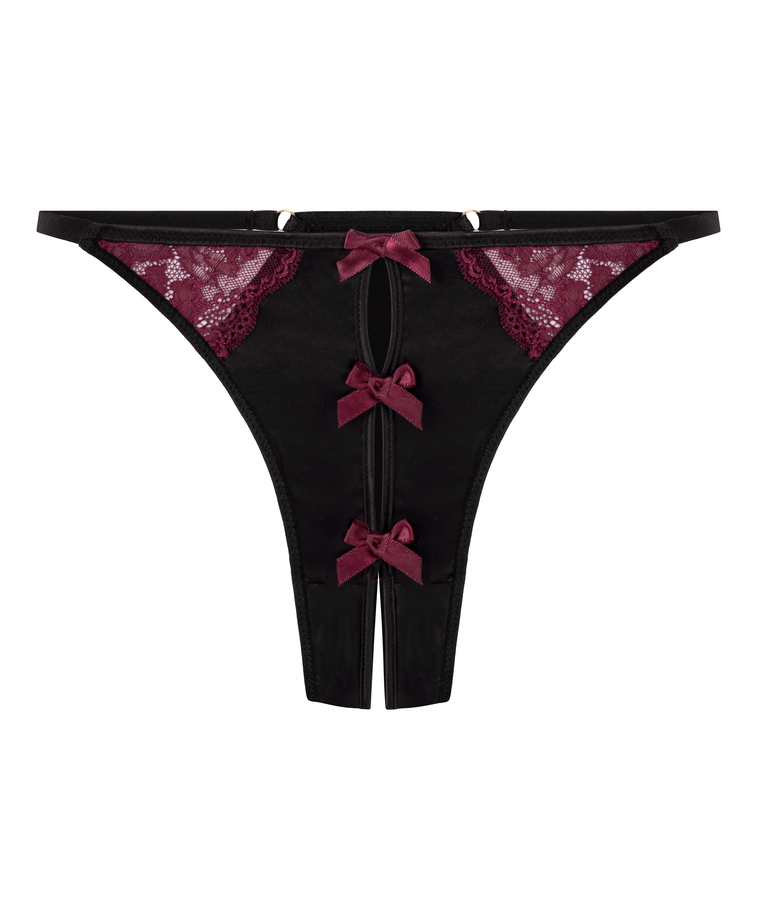 Feminint møder modigt i denne g-streng. Denne g-streng er designet til at være flatterende og har et højt snit, der forlænger din silhuet, mens blondepaneler på siderne tilføjer et romantisk touch. Nede i midten skaber et spor af fine sløjfer et charmerende fokuspunkt, og nederst er der et åbent skridt. Fuldend looket med den matchende bh.