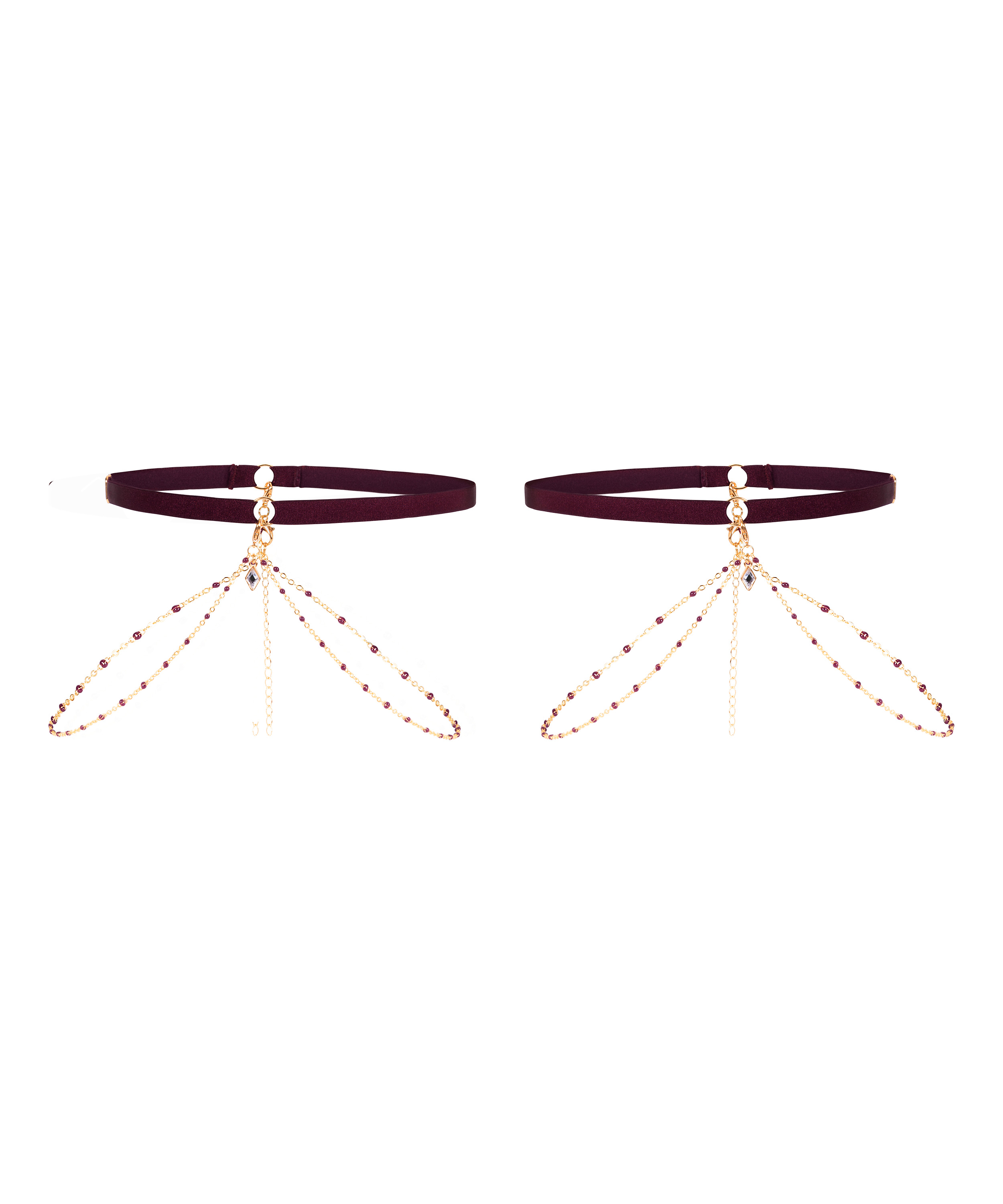 Tilføj et strejf af glamour til dit look med disse betagende strømpebånd. Strømpebåndene er designet til at sidde behageligt på låret og har ædelstensudsmykninger, der glimter ved hvert skridt. Uanset om de er stylet med lingeri eller brugt som et statement-accessory, giver disse strømpebånd den perfekte blanding af femininitet og kant.
