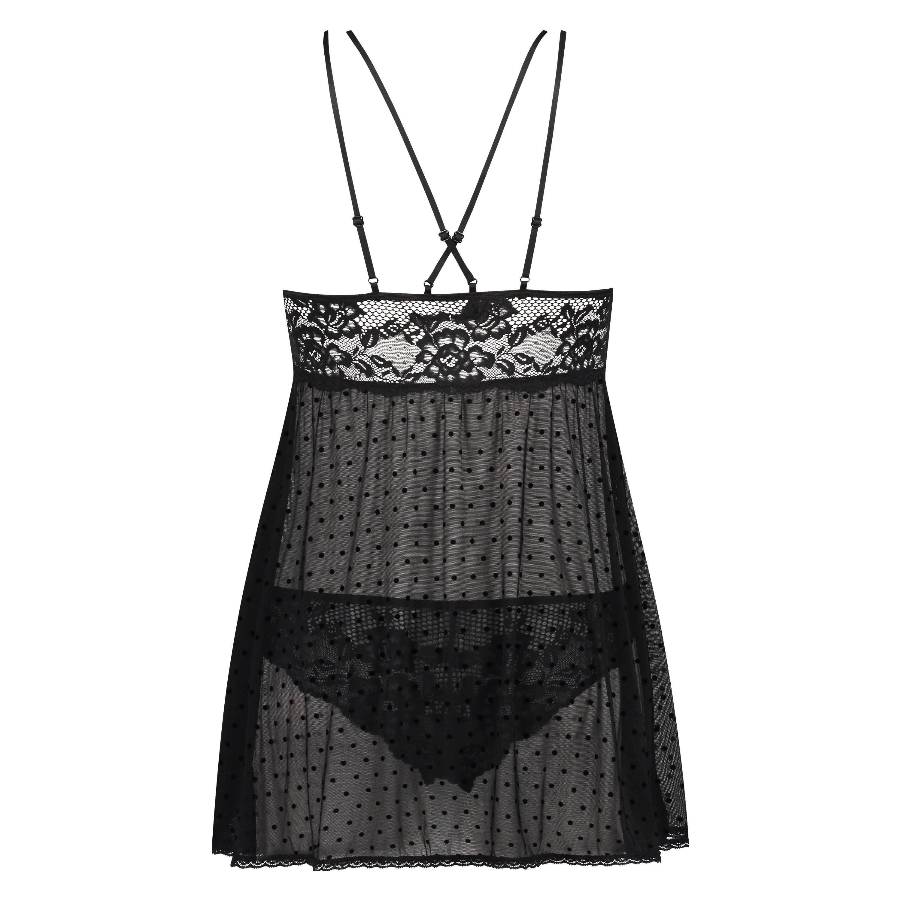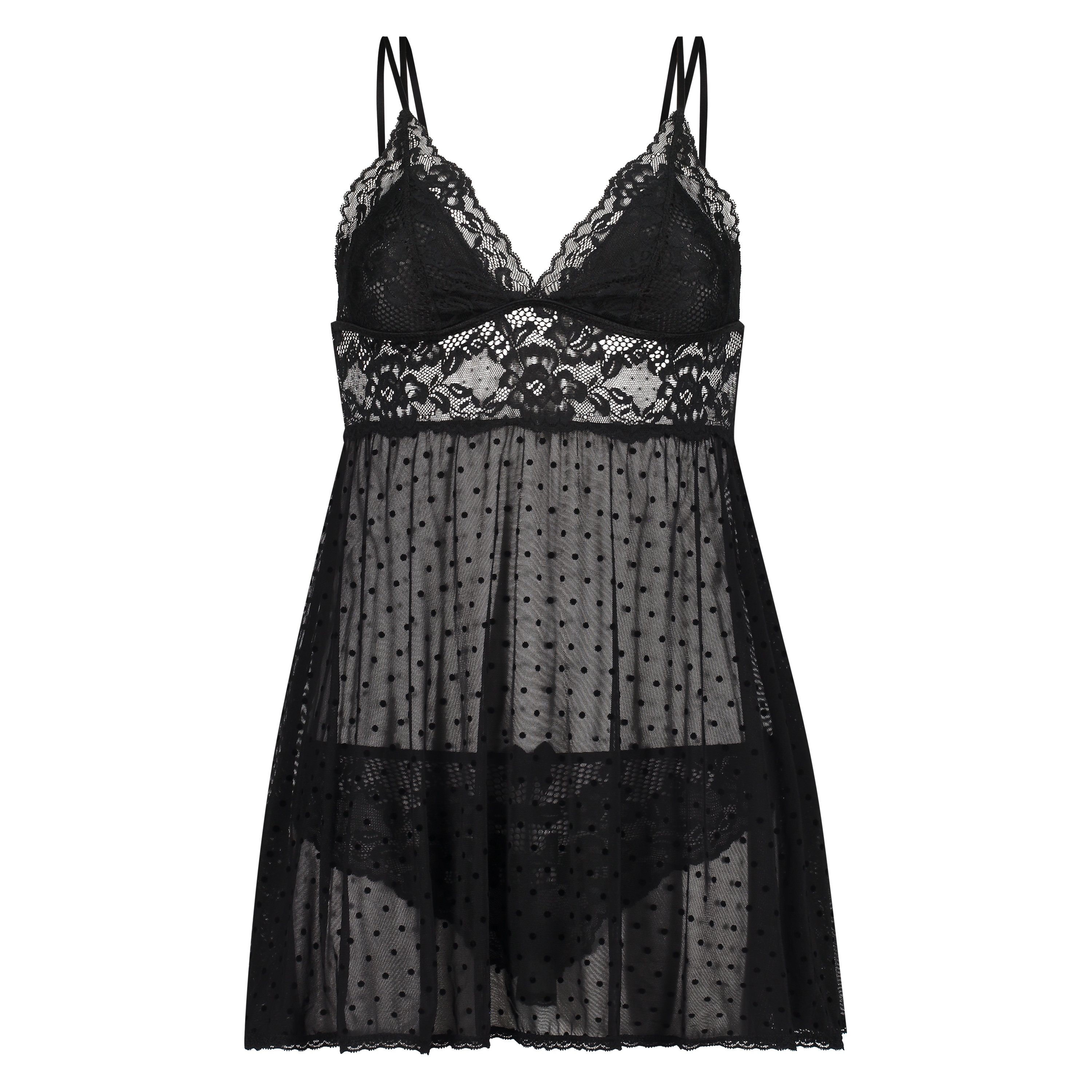 Føl dig sexet i denne non-wired babydoll! Denne babydoll har detaljer i blonder og mesh, justerbare stropper og er fuldendt med et polkaprikket mønster. De matchende trusser er lavet af en blanding af blonder og mesh.