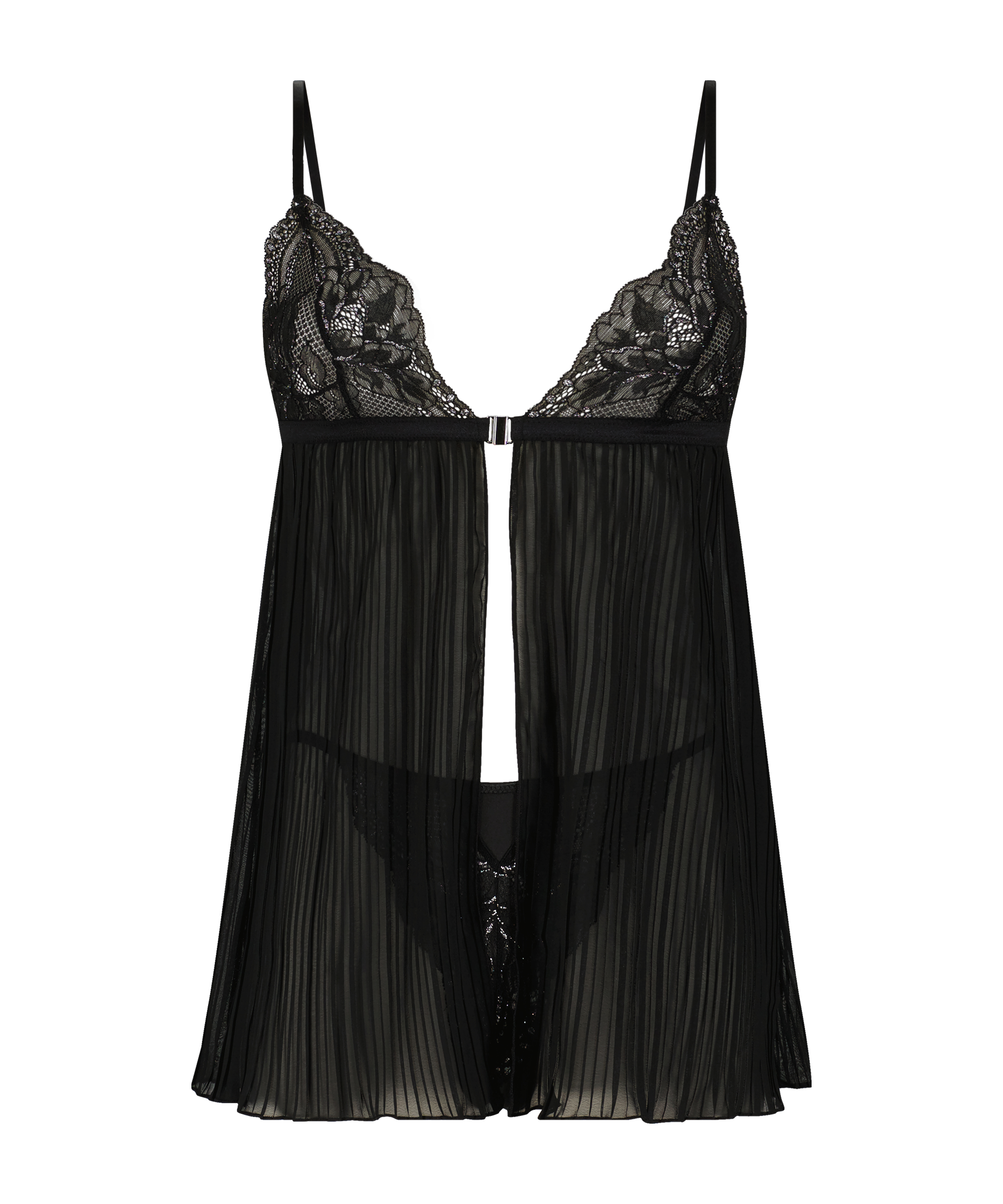 Bring lidt glamour til din lingerikollektion med denne smukke babydoll med blonder! Luksuriøse sølvdetaljerede blonder og justerbare stropper gør denne sexede babydoll til en drøm at trække i. Den har en frontlukning og kommer med en matchende brasiliansk slip.