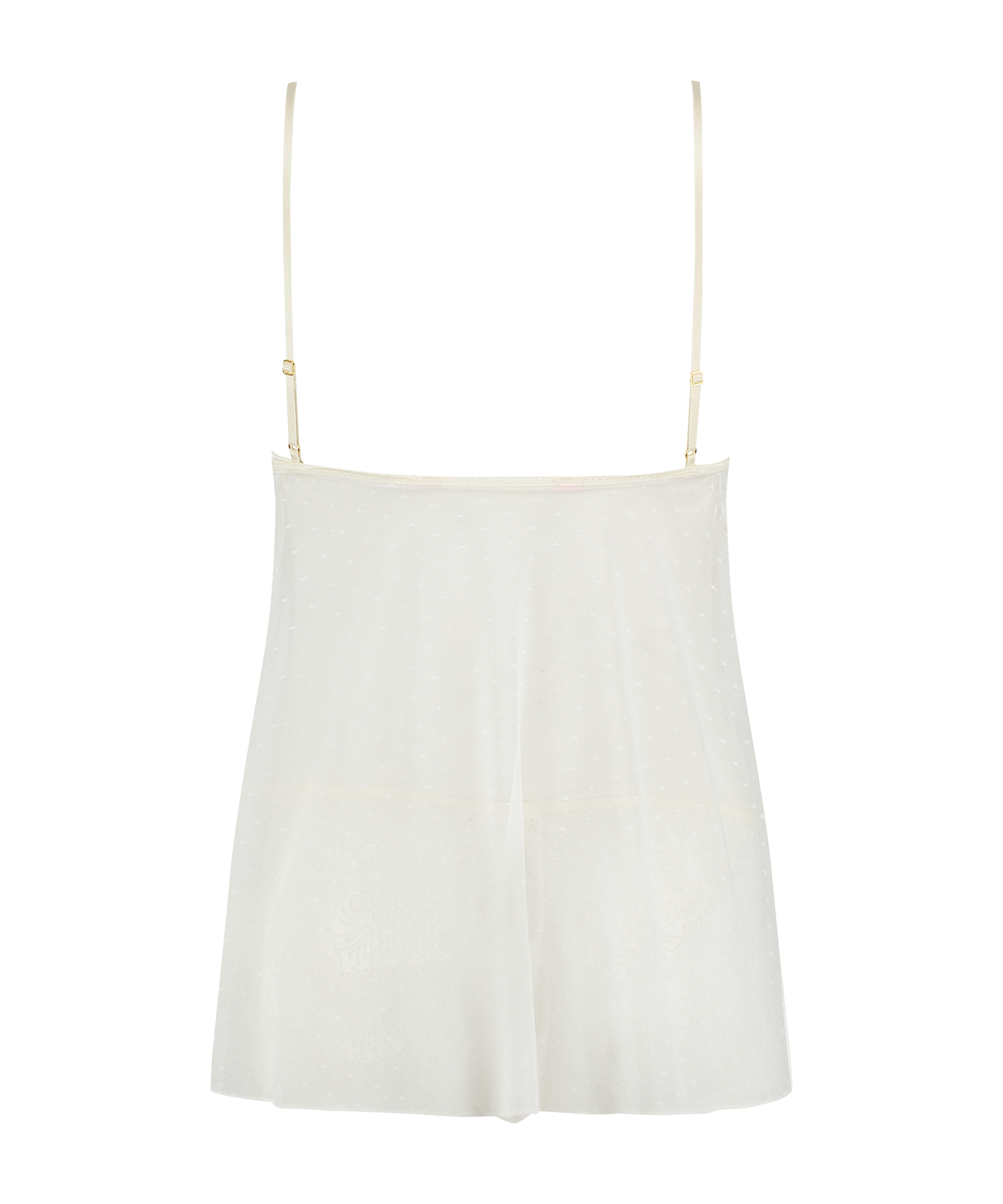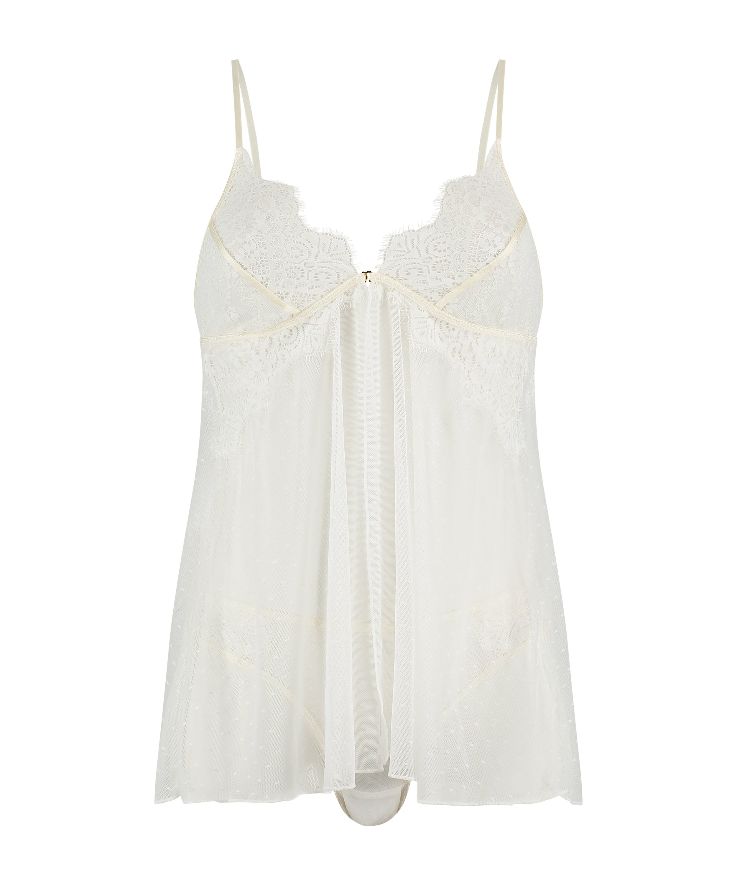 Denne babydoll er præcis, hvad du leder efter! Med blonder og et halvgennemsigtigt materiale over det hele. Også skålene er betrukket med blonder og snoredetaljer. Med lukning foran, så den er nem at tage af og på. Det bedste er, at den fås med matchende trusser!