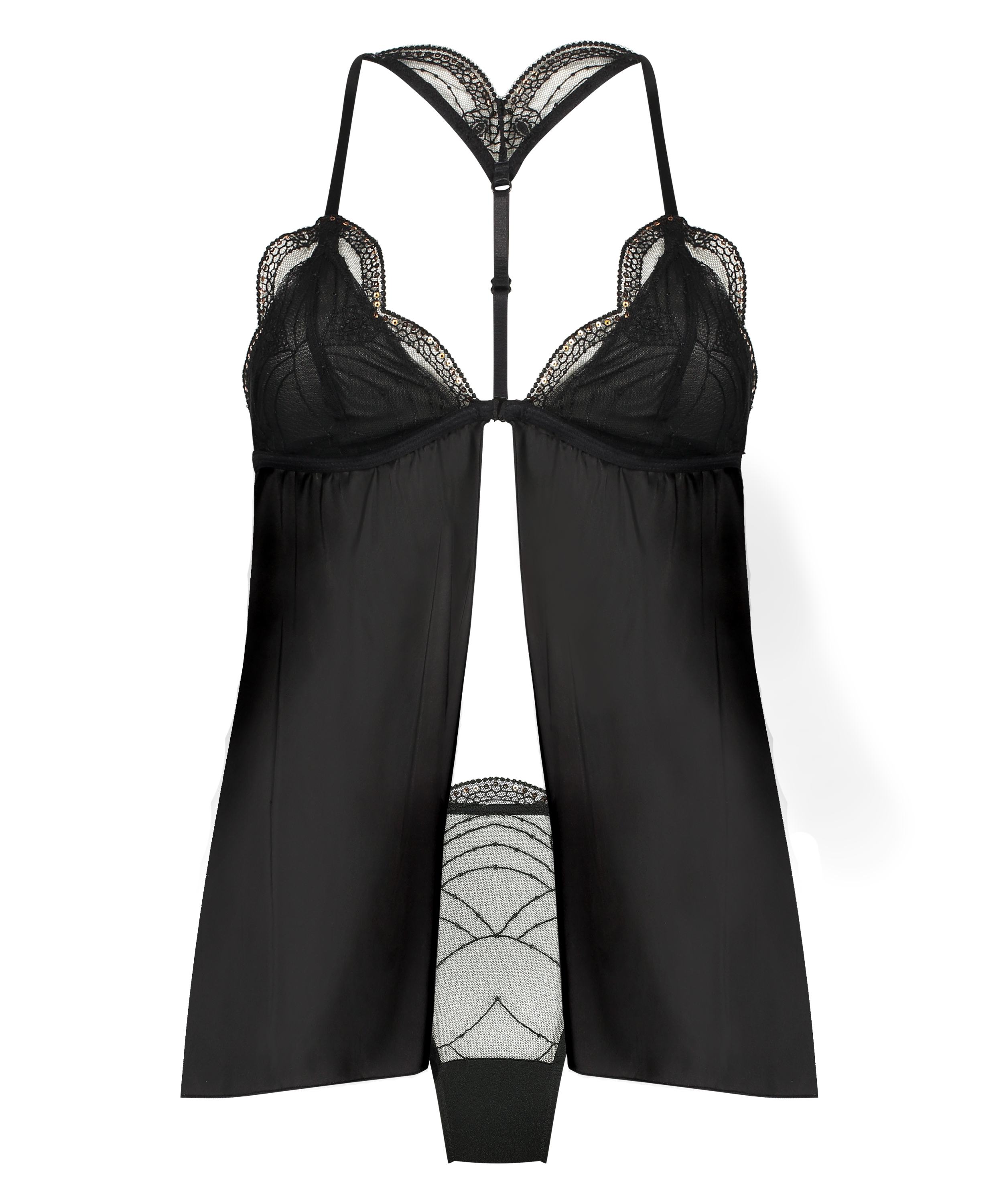 Leder du efter en sexet babydoll? Så er dette den perfekte. Forsiden er åben, og babydoll har et satinlignende stof. Båndene kan indstilles og blonderne fortsætter op over skuldrene