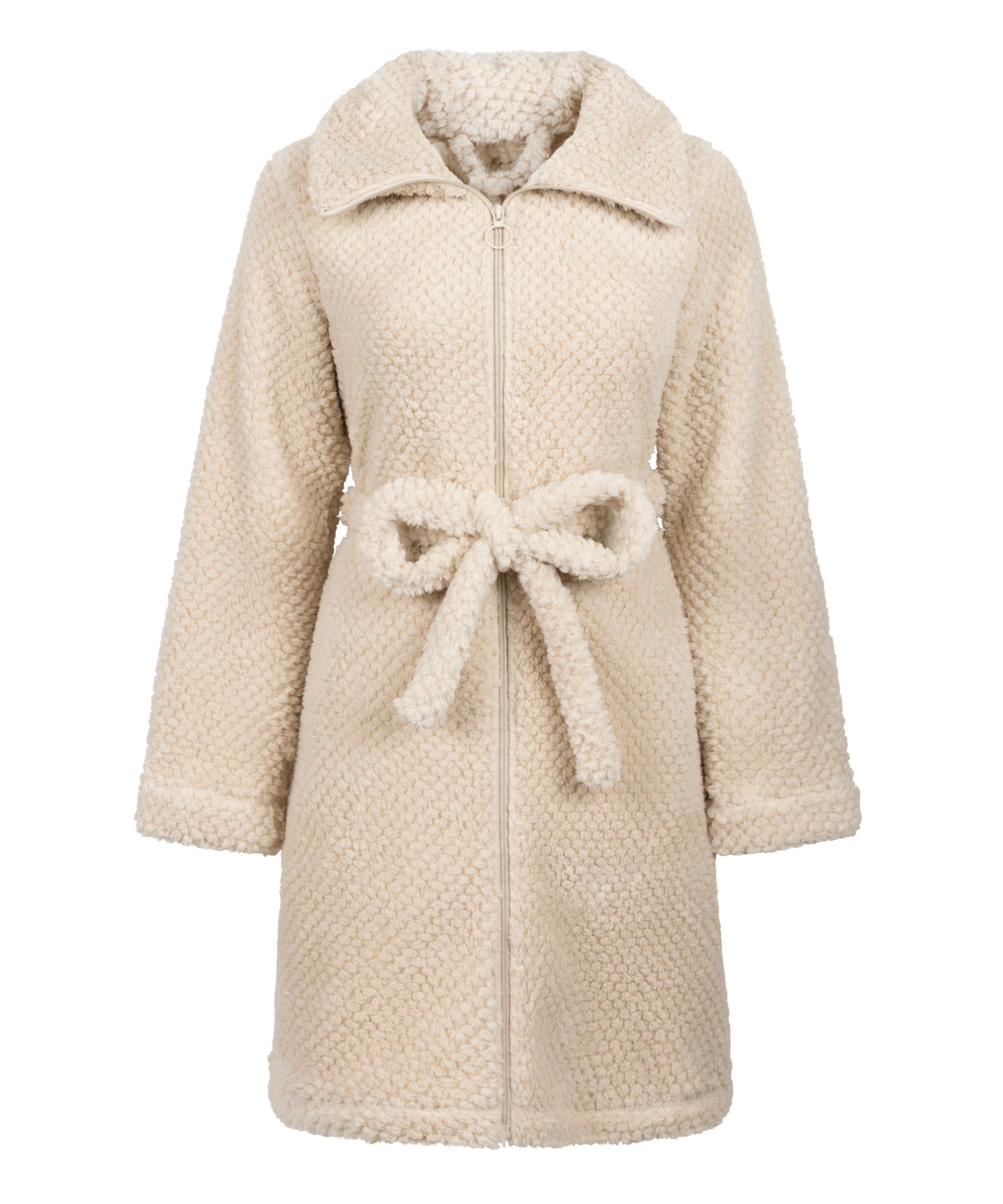 Pak dig ind i denne bløde fleece-badekåbe med lynlås, designet til hygge og en tætsiddende pasform. Den er lavet af ultrablød fleece og giver behagelig varme uden at være fyldig, hvilket gør den perfekt til kølige morgener, afslappede aftener eller afslapning efter badet.
