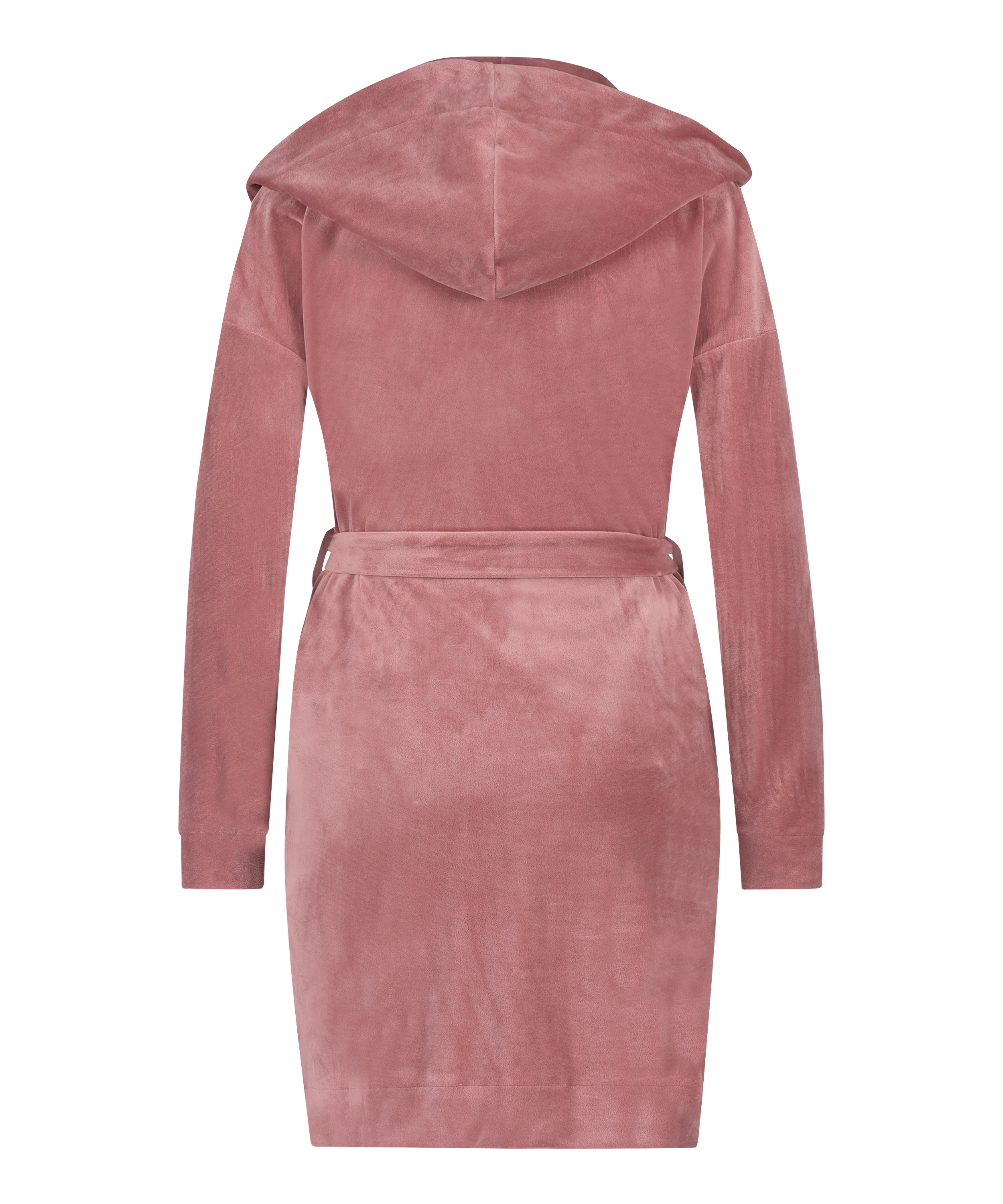 Denne badekåbe er dejligt behagelig! Den er lavet af velour, hvilket gør den ekstra blød. Der er to lommer foran. Dejlig at have på over din pyjamas!