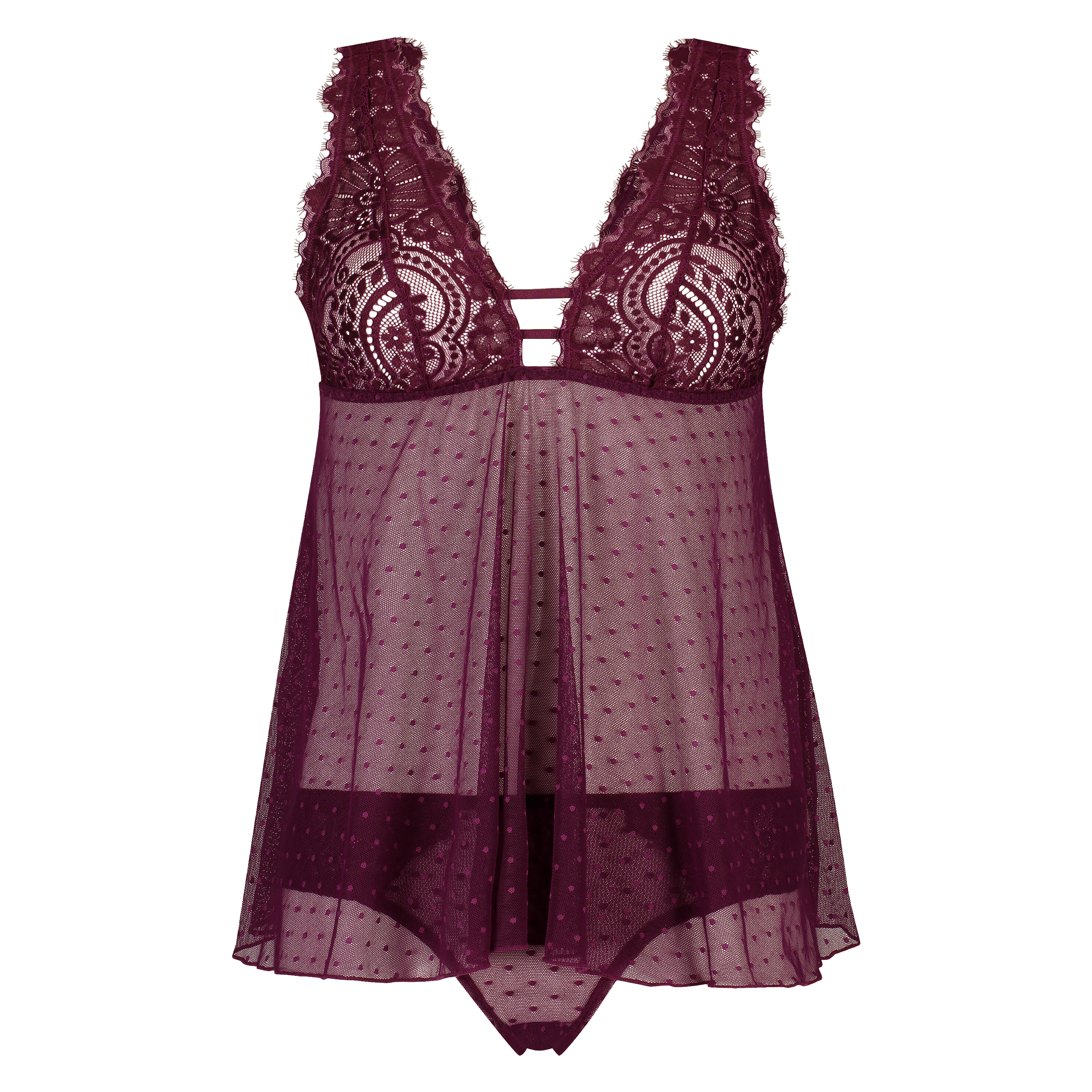 Nej, hvor sødt! Trussen er fremstillet i halvtransparent meshstof. Og toppen er af mesh- og blondestof, og dekoreret med stropdetaljer.