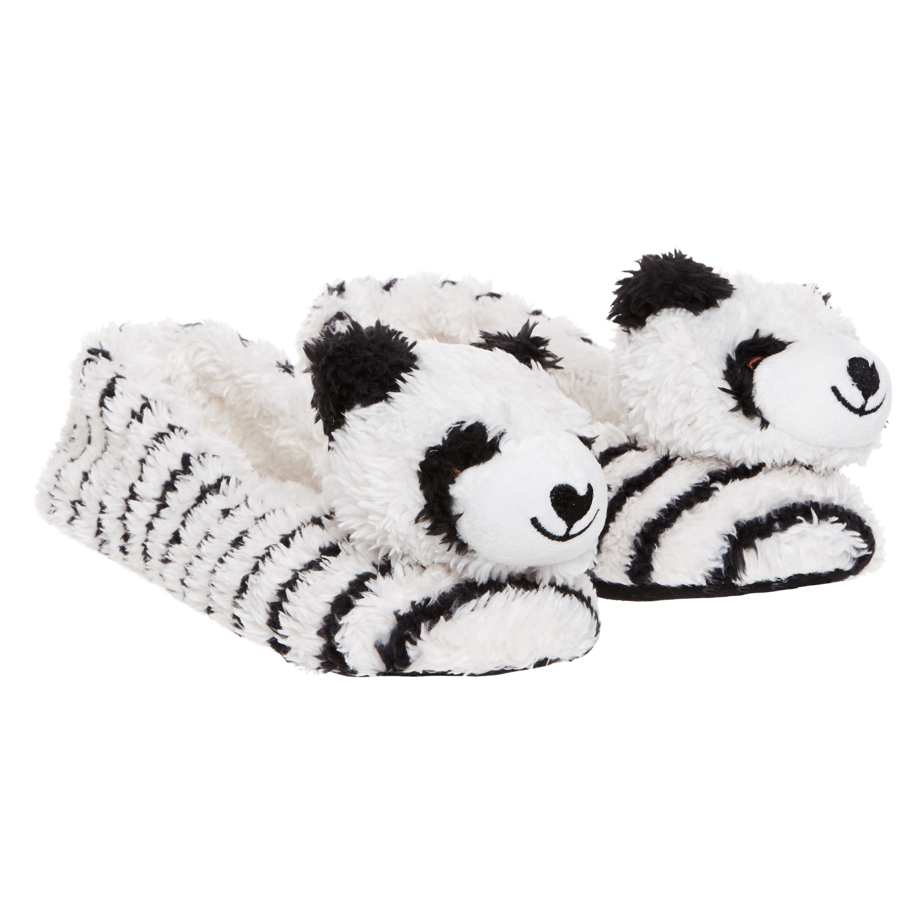These super soft and comfortable fluffy ballerina slippers are white with black stripes and feature a cute panda head.