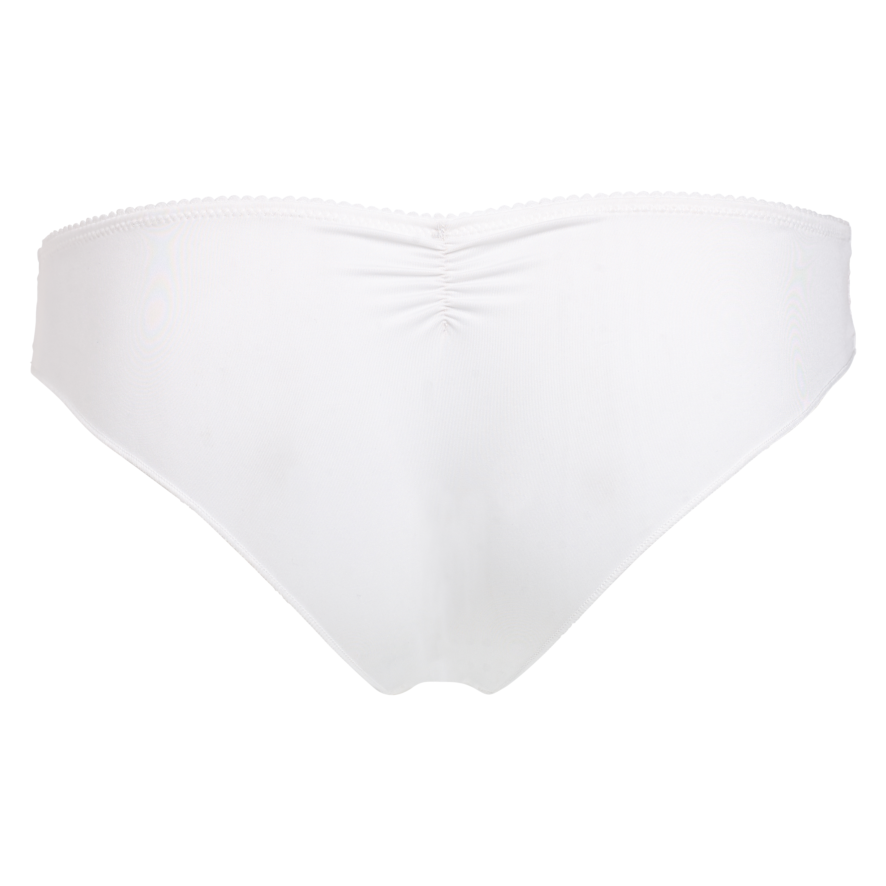 Flot brasiliansk trusse. Forstykket har en sløjfedetalje og er beklædt med blonder. Bagstykket er i halvtransparent stof og har tungekant.