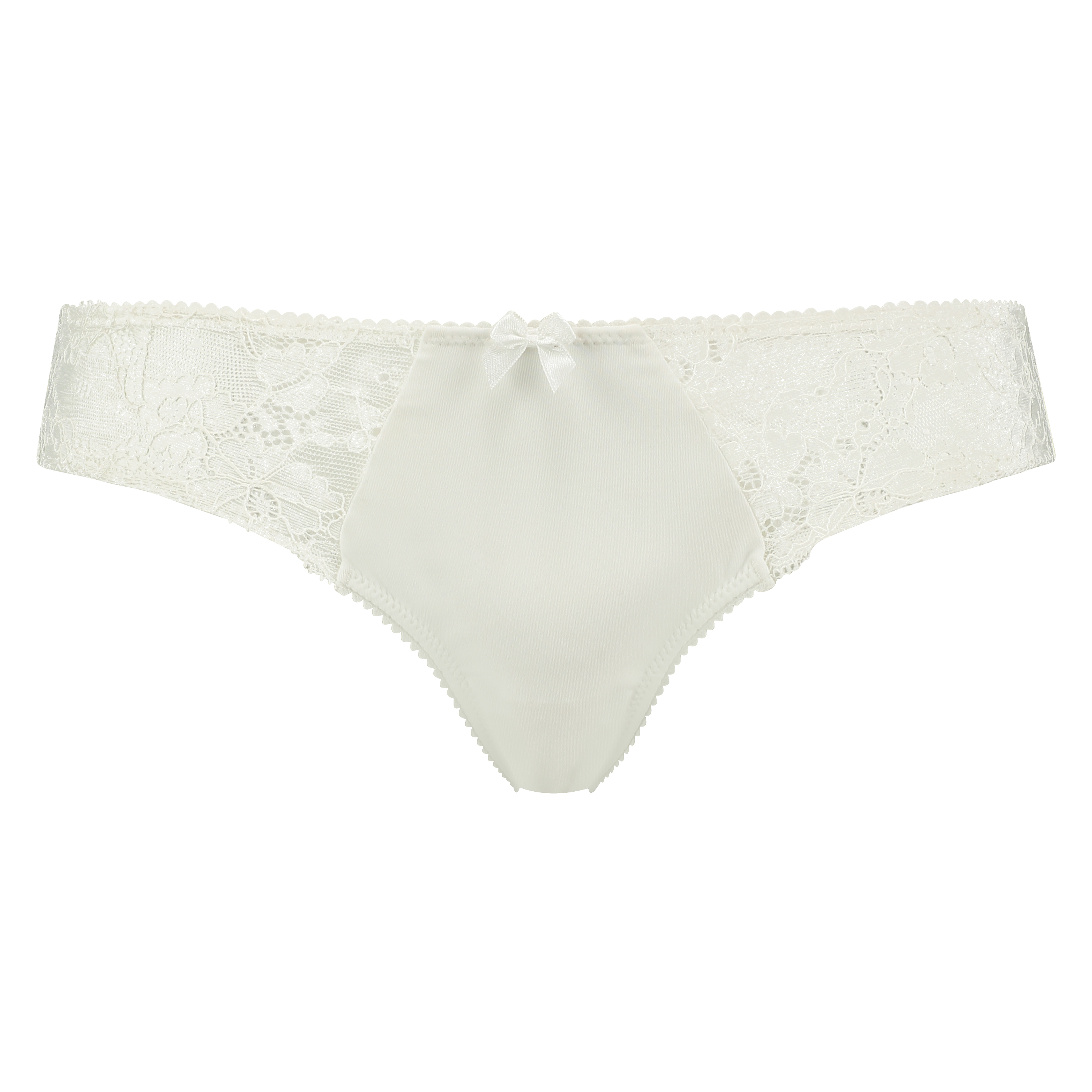 Flot brasiliansk trusse. Forstykket har en sløjfedetalje og er beklædt med blonder. Bagstykket er i halvtransparent stof og har tungekant.