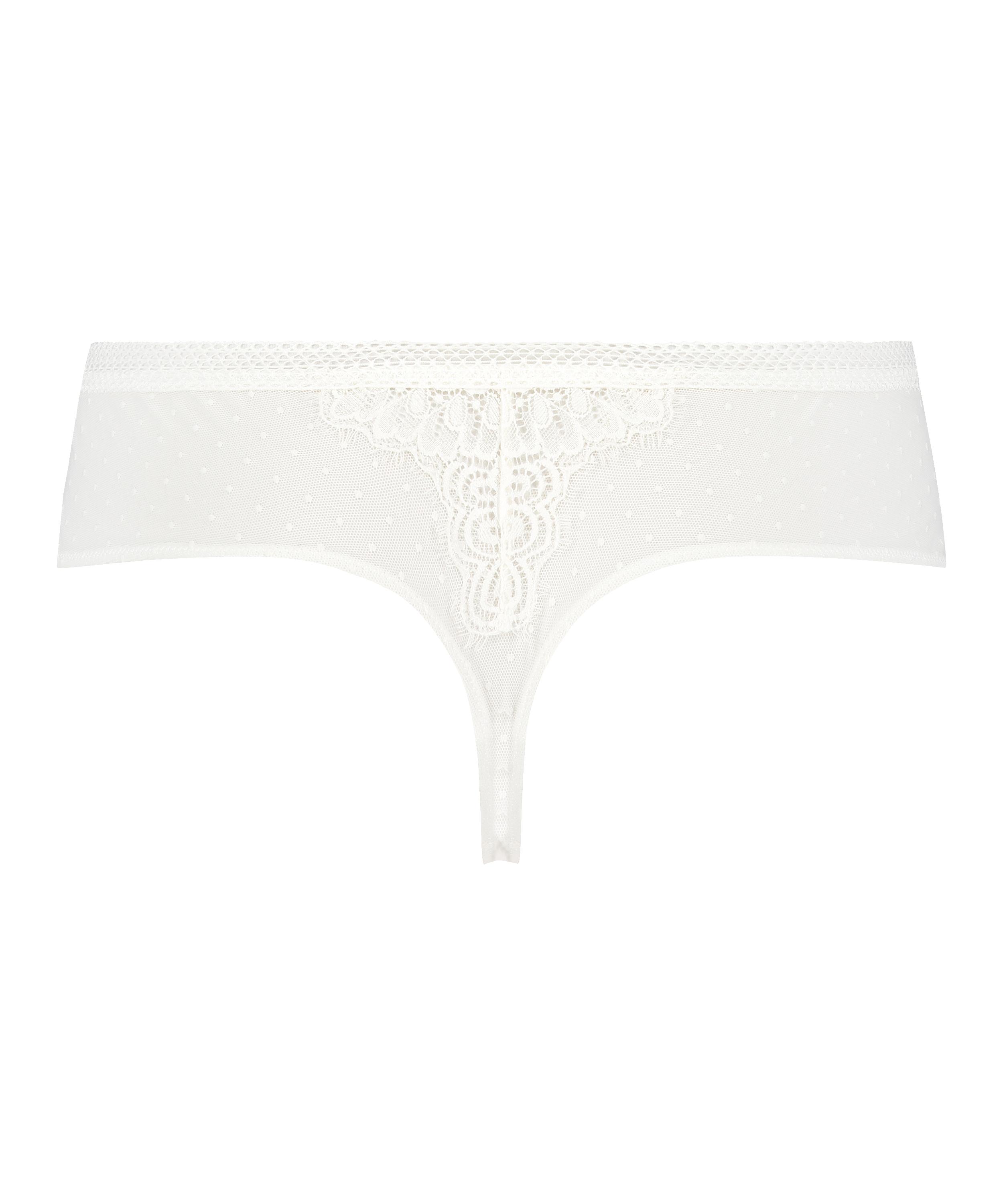 Forkæl dig selv med disse smukke g-streng-hipsters! Denne g-streng er næsten helt dækket af prikker og blonder. Med en sød lille sløjfe foran. Kombiner denne g-streng med den matchende bh for at fuldende sættet!