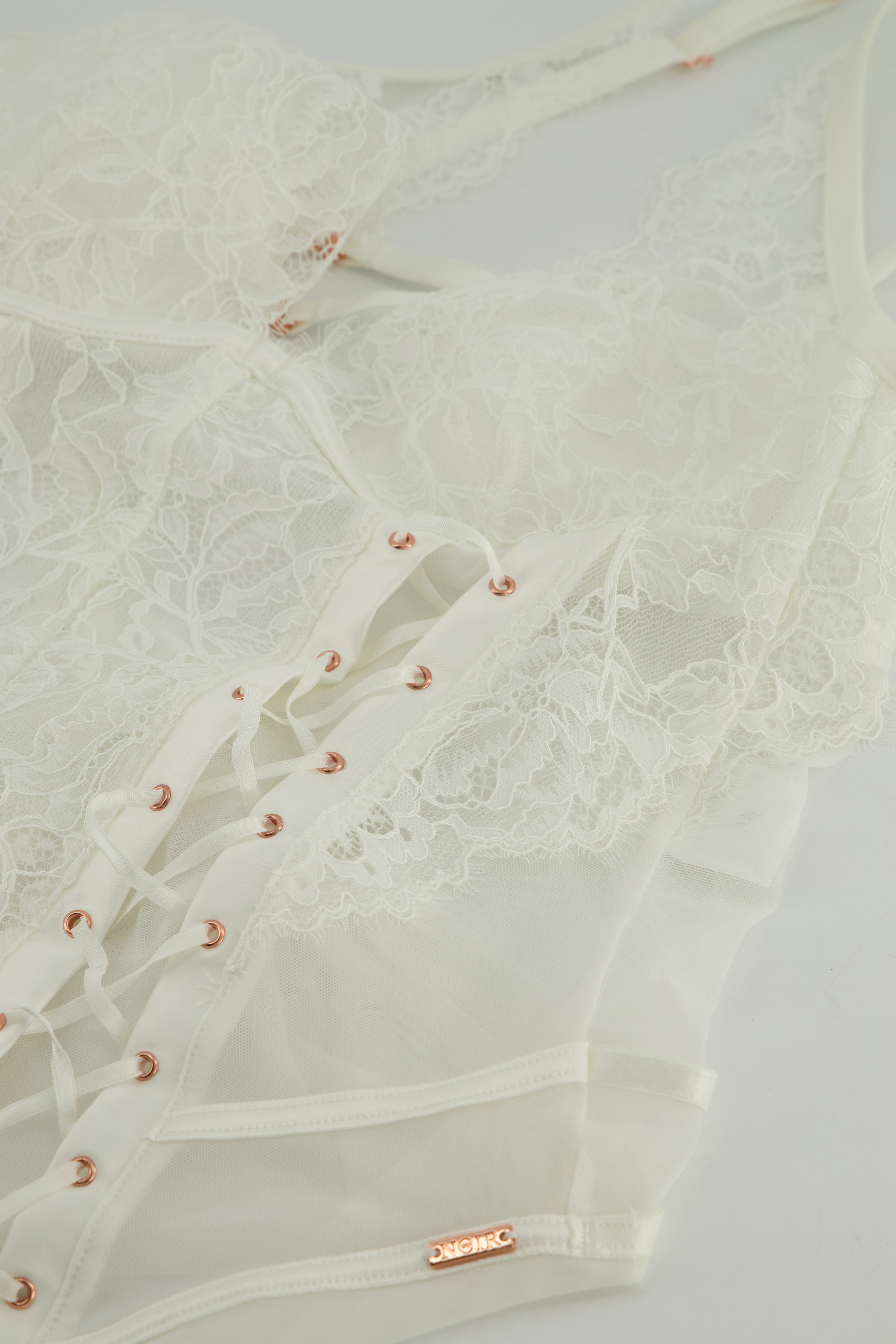 Denne body fremhæver din mest elegante og klassiske side! Med masser af romantiske blonder og gennemsigtigt materiale, der giver et semi-transparent look. Mange klassiske snoredetaljer i hele længden foran. Sæt sammen med en kimono!