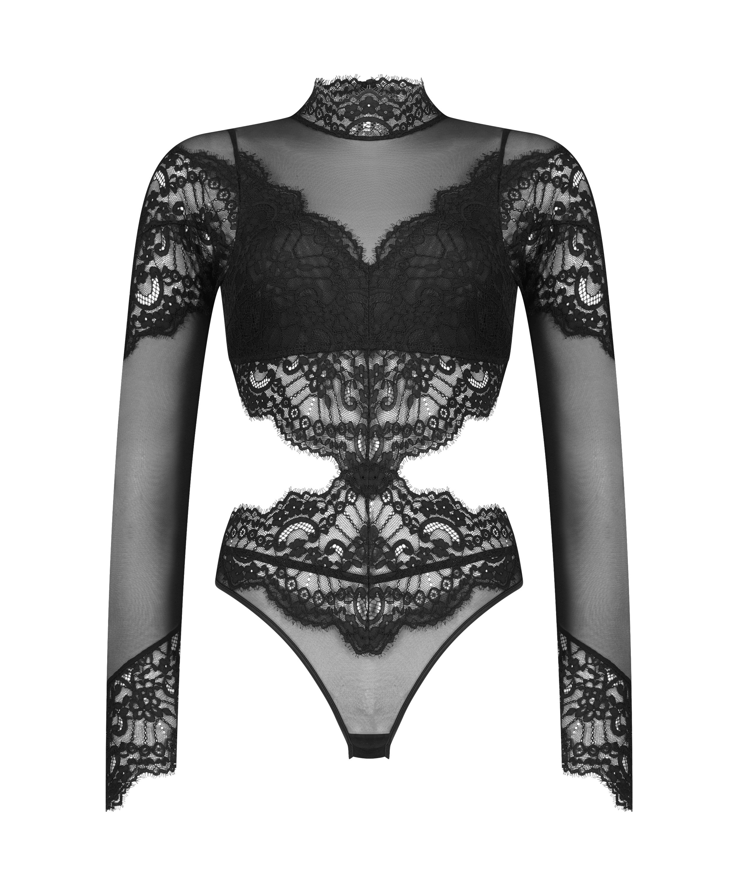 Føl dig elegant i denne smukke body! Den har åben ryg, mesh-detaljer og blonder for at skabe et fantastisk look. Match den med dine favoritter. En del af vores Noir-kollektion.