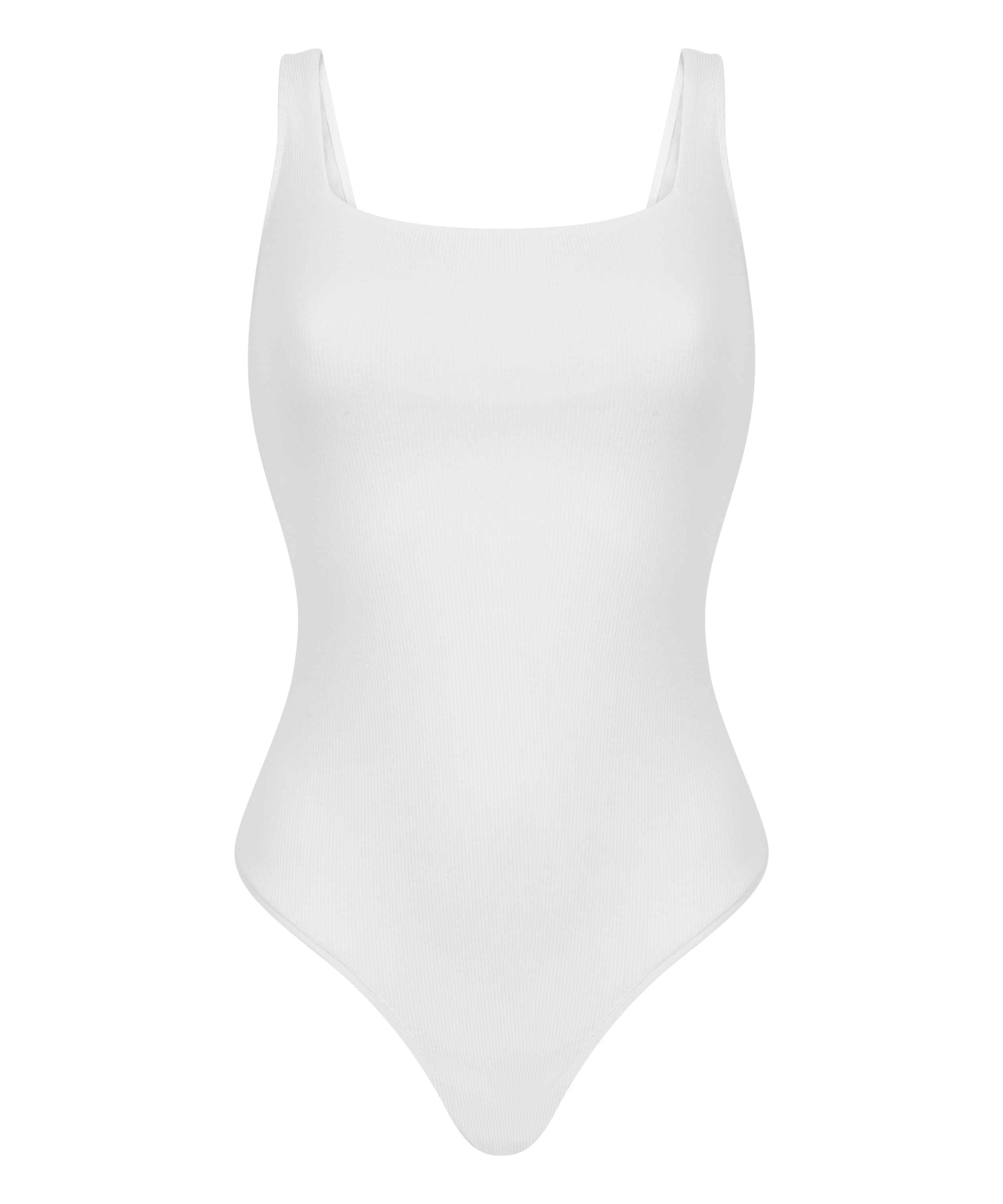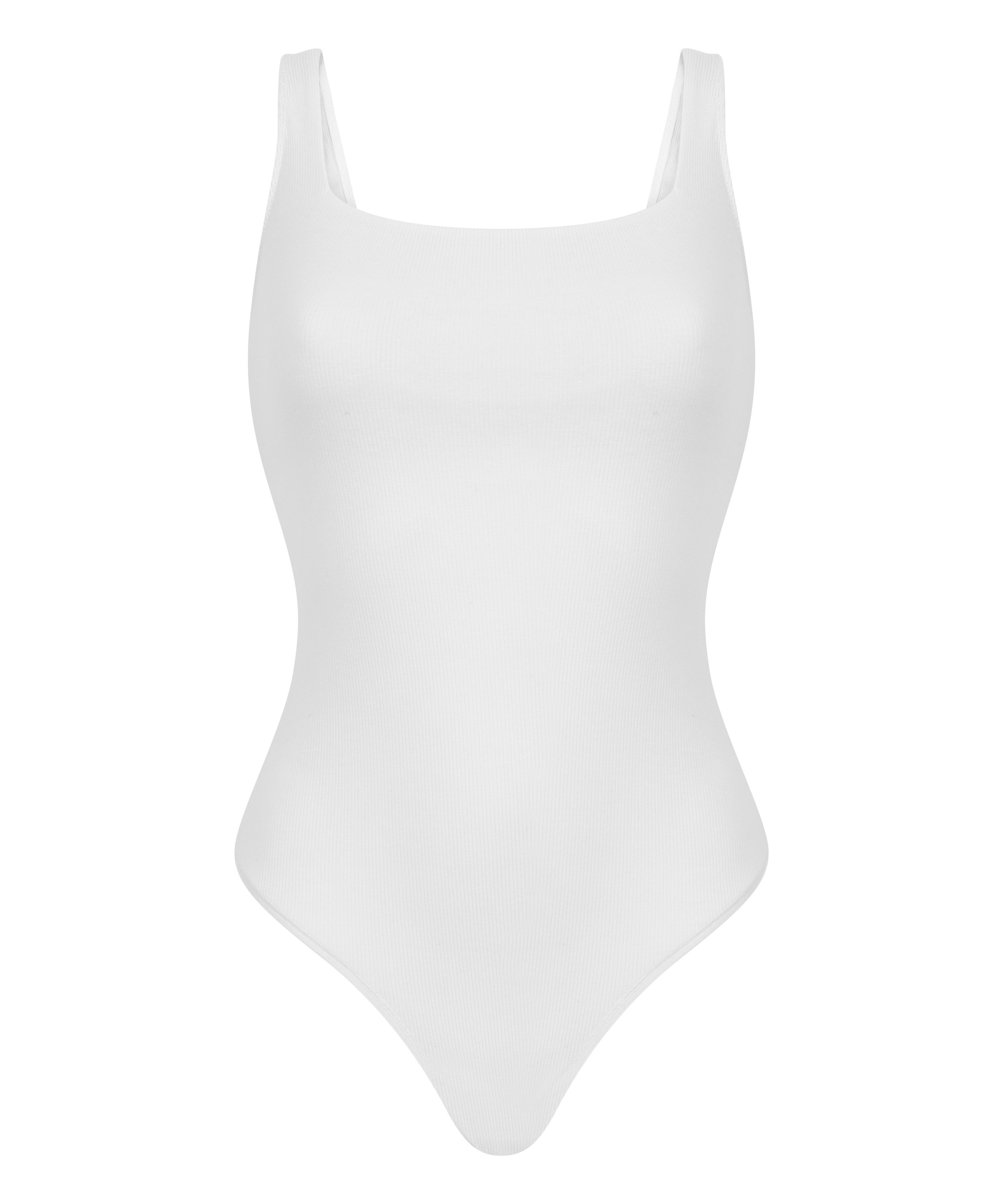 Bomuldsbody lavet af et blødt, ribbet materiale med brede stropper for ekstra støtte og et ekstra stoflag i brystområdet. Bagsiden har et bredt V-formet design og en bund i g-streng stil.