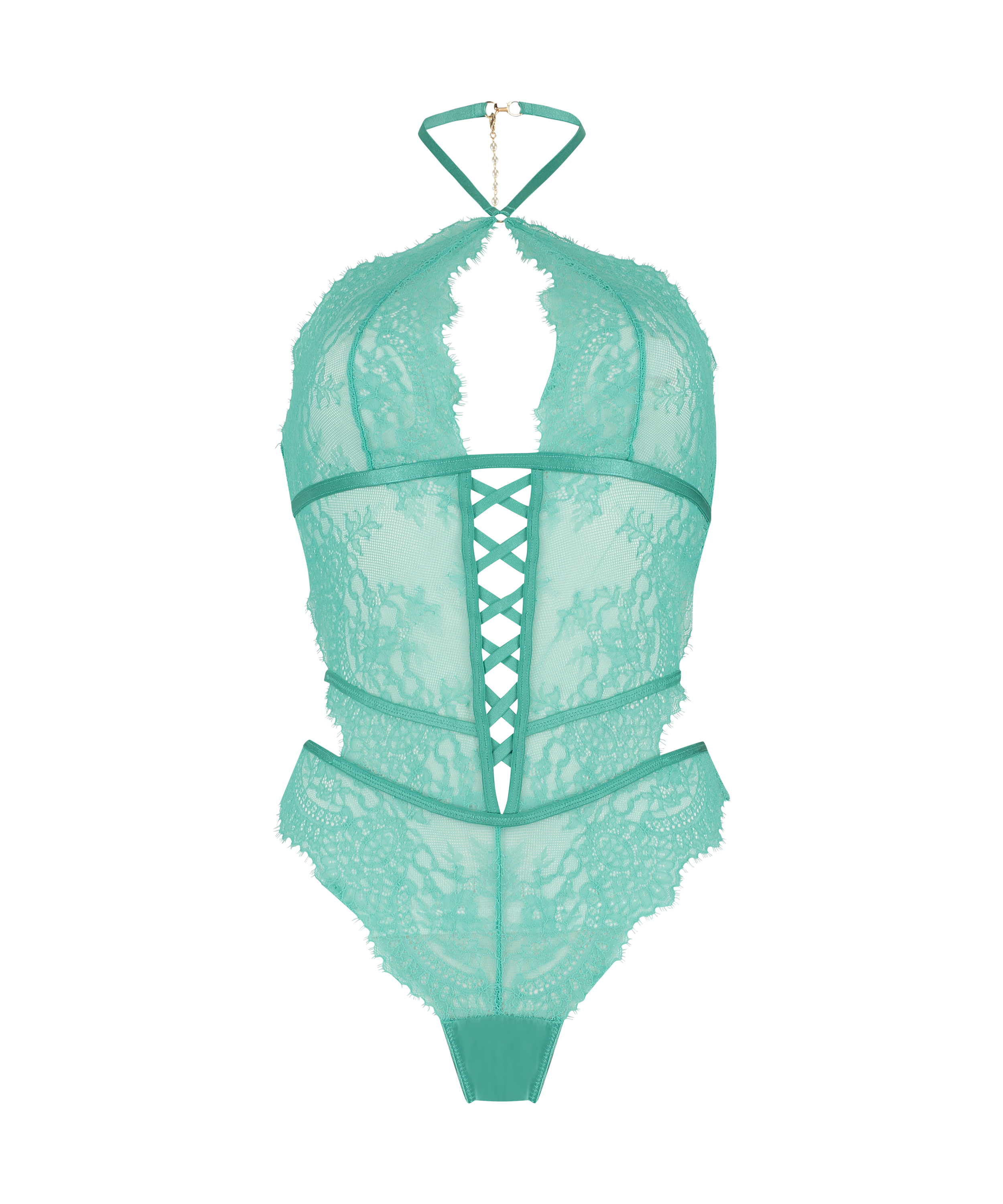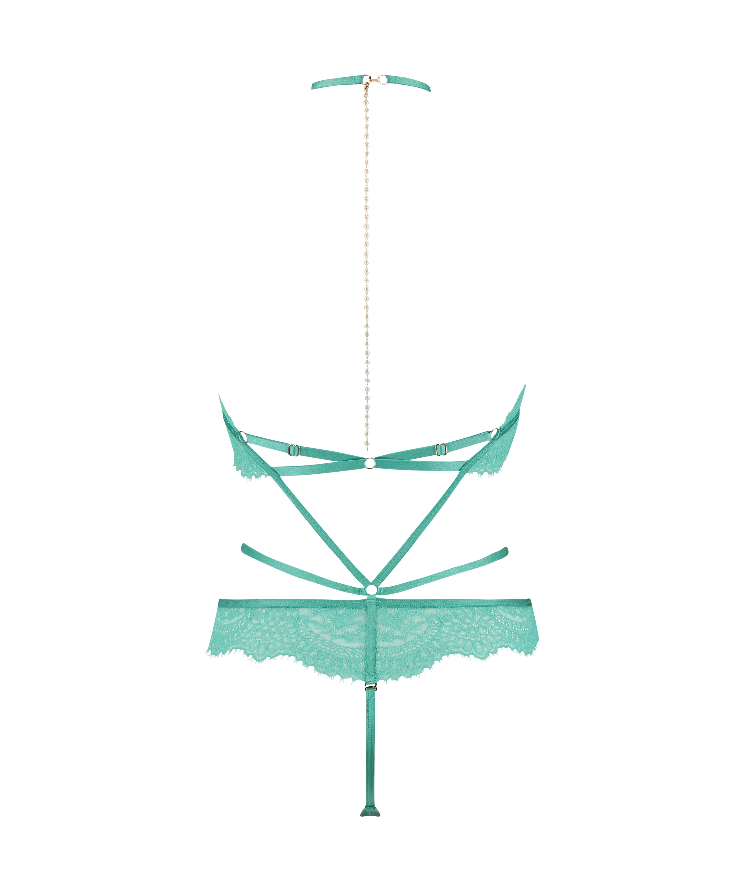 Føl dig sexet i denne body! Med blonder og halvgennemsigtigt materiale over det hele. Med masser af snordetaljer foran og bagpå for lidt ekstra spice. Bagpå er den dekoreret med en smuk halskæde af imiterede perler.