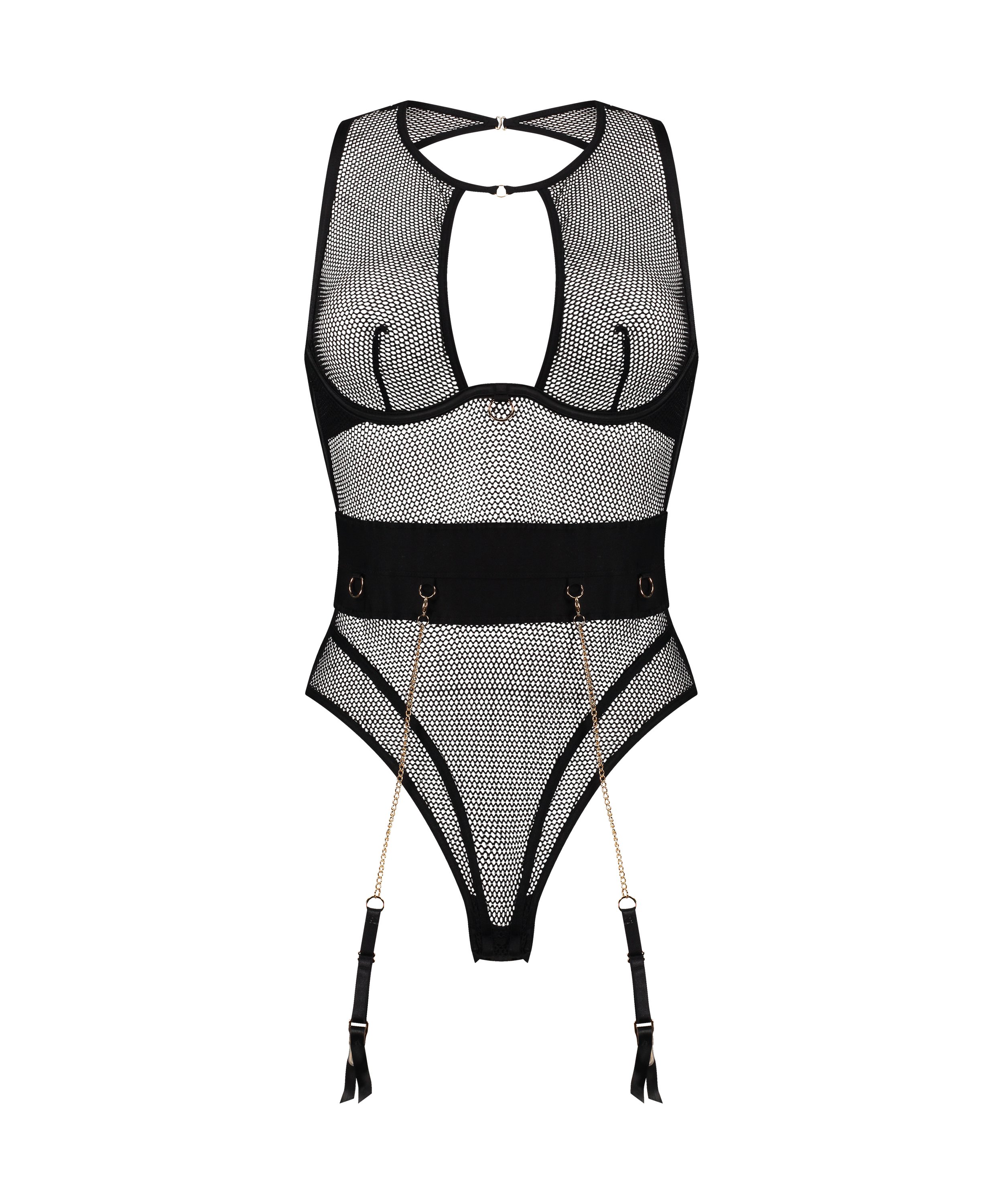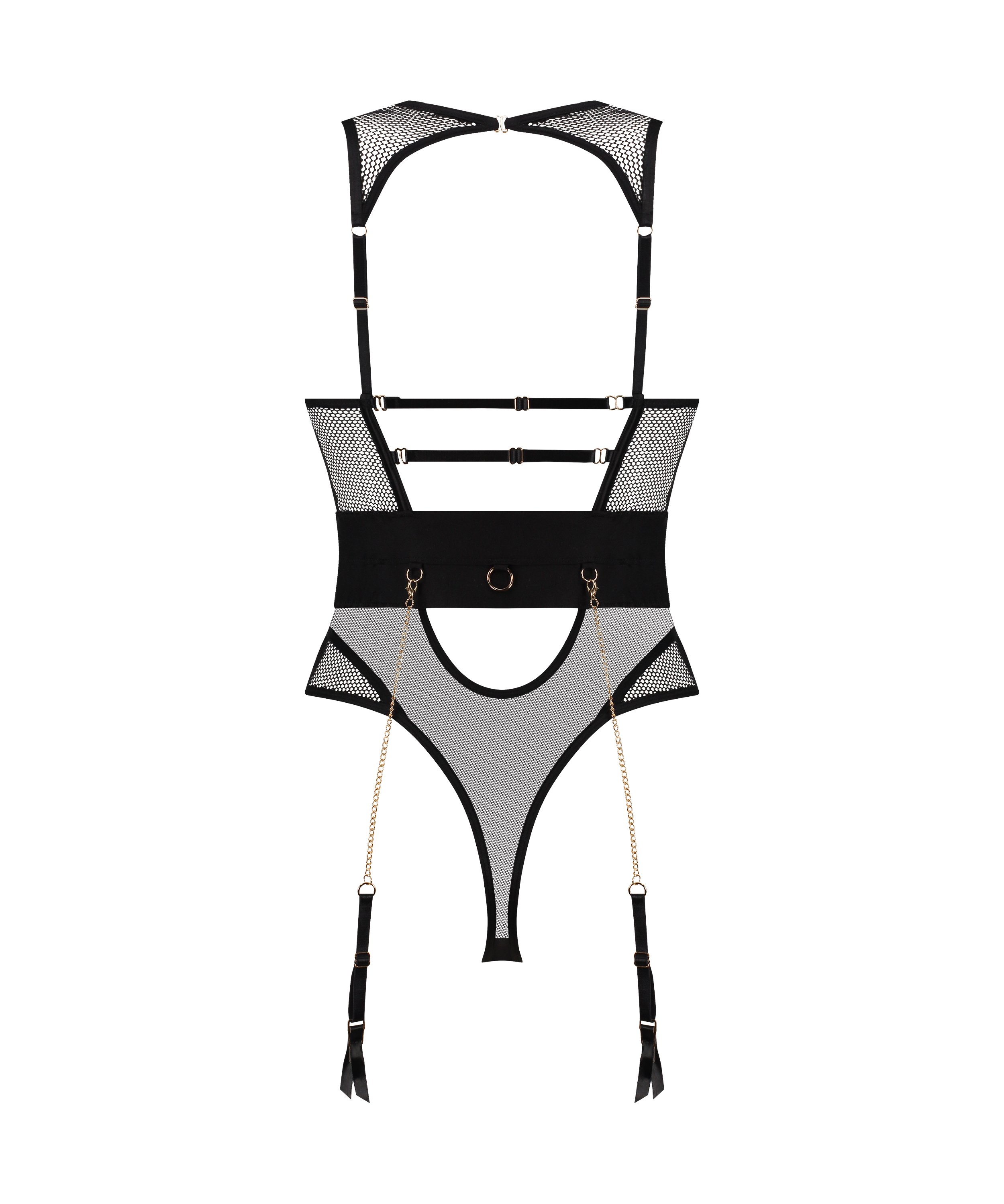 Denne bodysuit er lavet af et delikat mesh-stof med en smigrende pasform. Designet inkluderer et unikt bæltedetalje med guldaccenter og justerbare stropper.