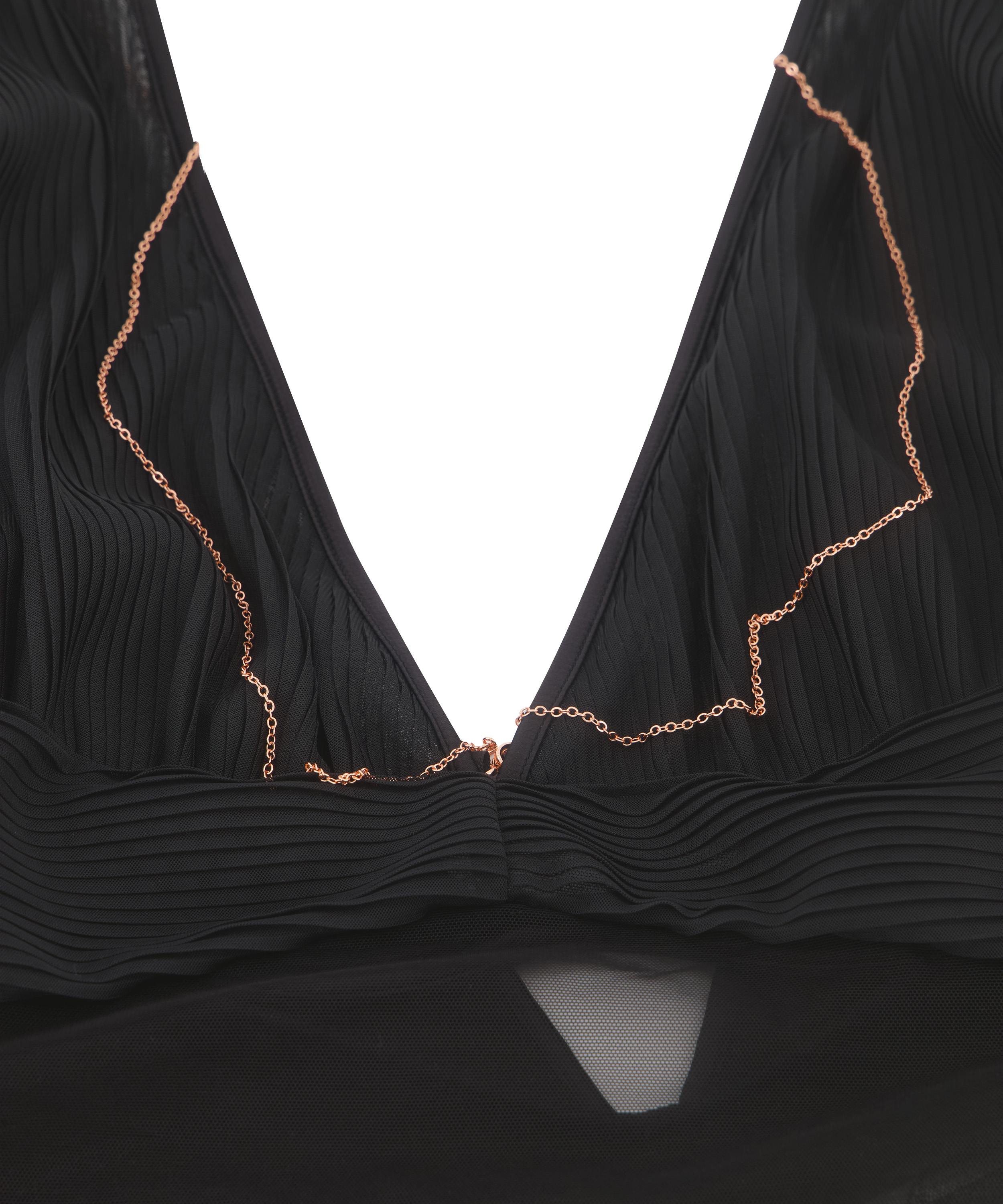 Forkæl dig selv med sensuel elegance med vores Simona body! Med dens perfekte dybe halsudskæring dekoreret med en aftagelig kæde, udstråler denne body en sofistikeret charme. Den dybe V-ryg og den praktiske lukkeklemme tilføjer et ekstra strejf af glamour. Opgradér din lingerikollektion med denne forførende body!
