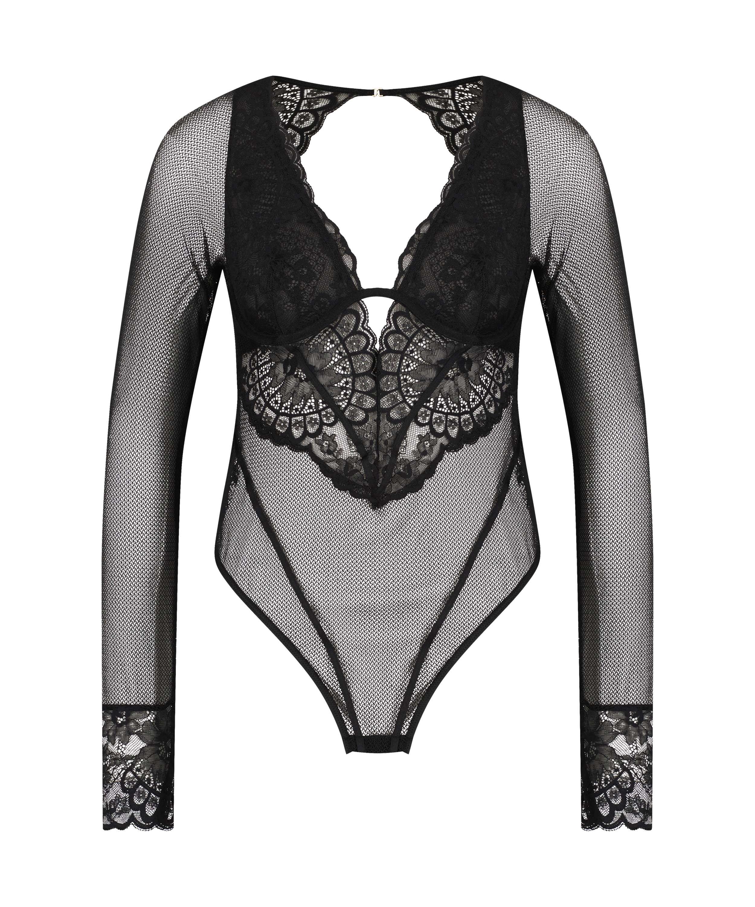 Blød, forførende blondebody med lange ærmer og bøjlestøtte. Denne body er tætsiddende og giver en slank, uimodståelig silhuet med rygudskæring og tryklåslukning forneden.