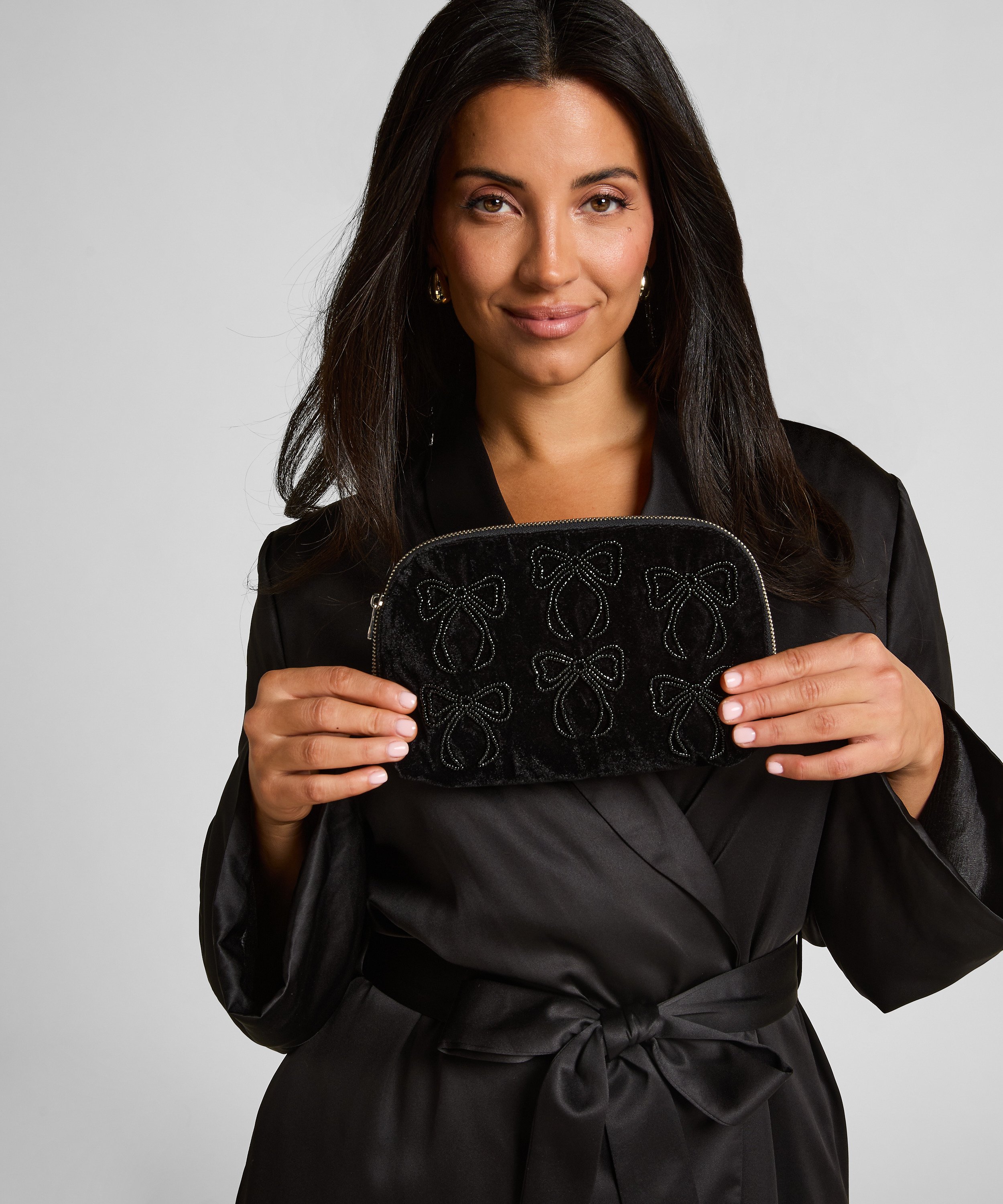Tilføj et strejf af glimmer til din skønhedsrutine med denne yndige makeuptaske, der er pyntet med fine sløjfer for et spændende, men poleret look. Den er designet til at rumme dine daglige fornødenheder og samtidig tilføre lidt ekstra charme til dit toiletbord eller din håndtaske.