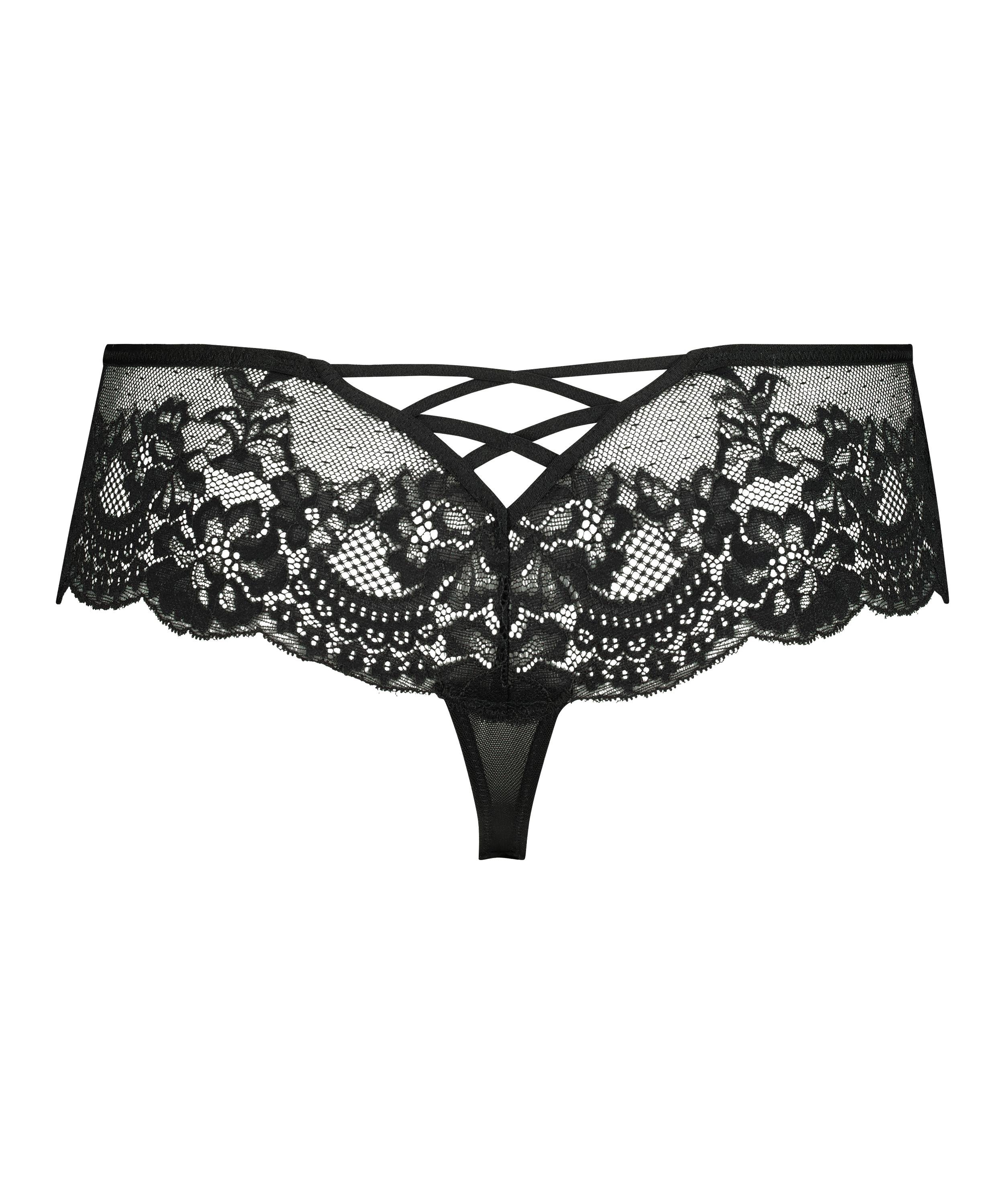 Hvor sexet er ikke denne boxer g-streng! Trussen indeholder et skinnende mikrofiberstof, der giver en glamourøs effekt, og er lavet af mange blonder. Derudover har bagsiden en elastisk V-åbning, der gør trussen ekstra sexet. Match med en tilsvarende bh og