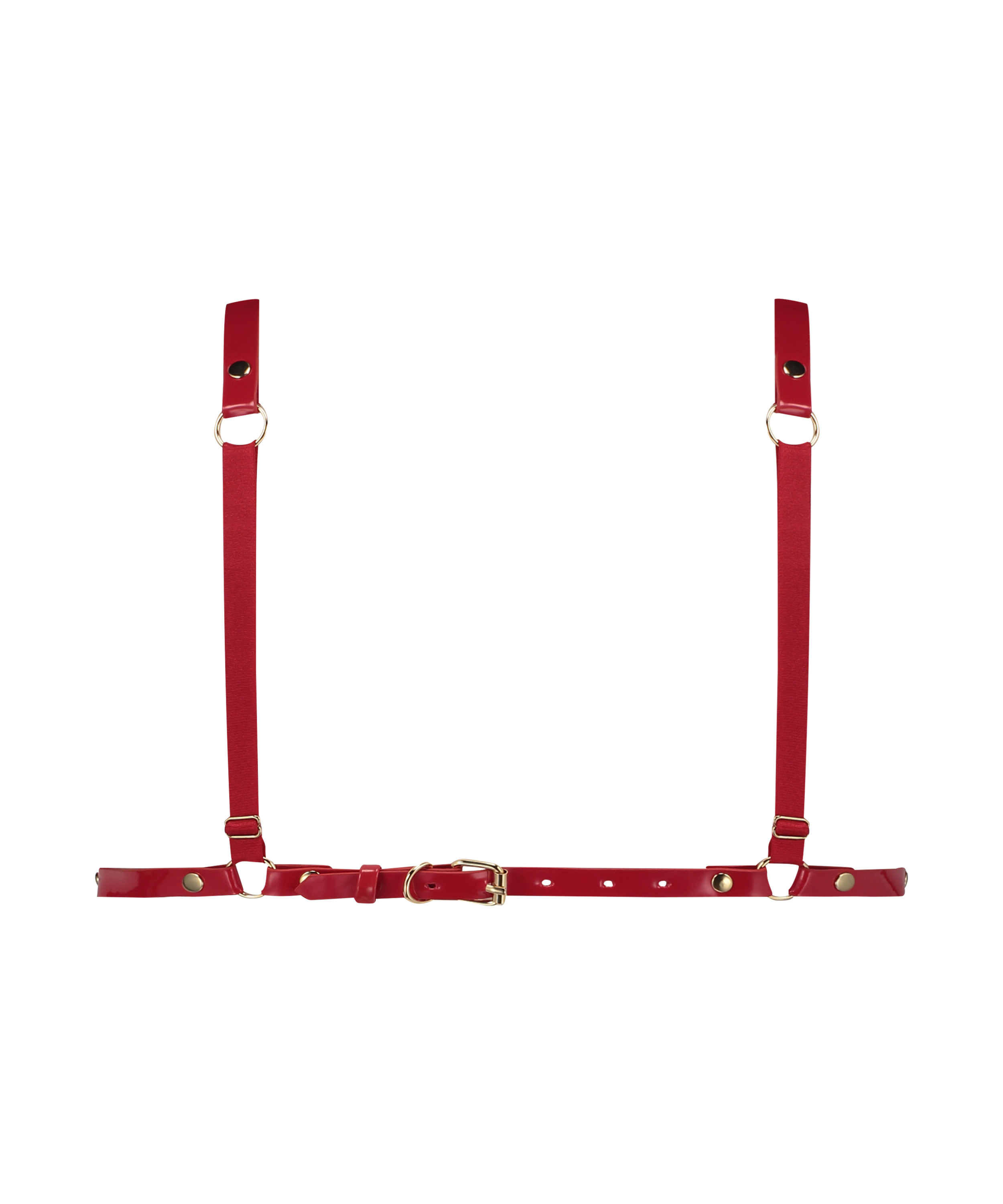 Vil du give dit sæt et løft? Så er denne bralette i kunstlæder perfekt til dig. Lavet fuldstændigt af stropdetaljer, med justerbare stropper og nitter. Find de matchende hofteholdere, og fuldend dit sæt!