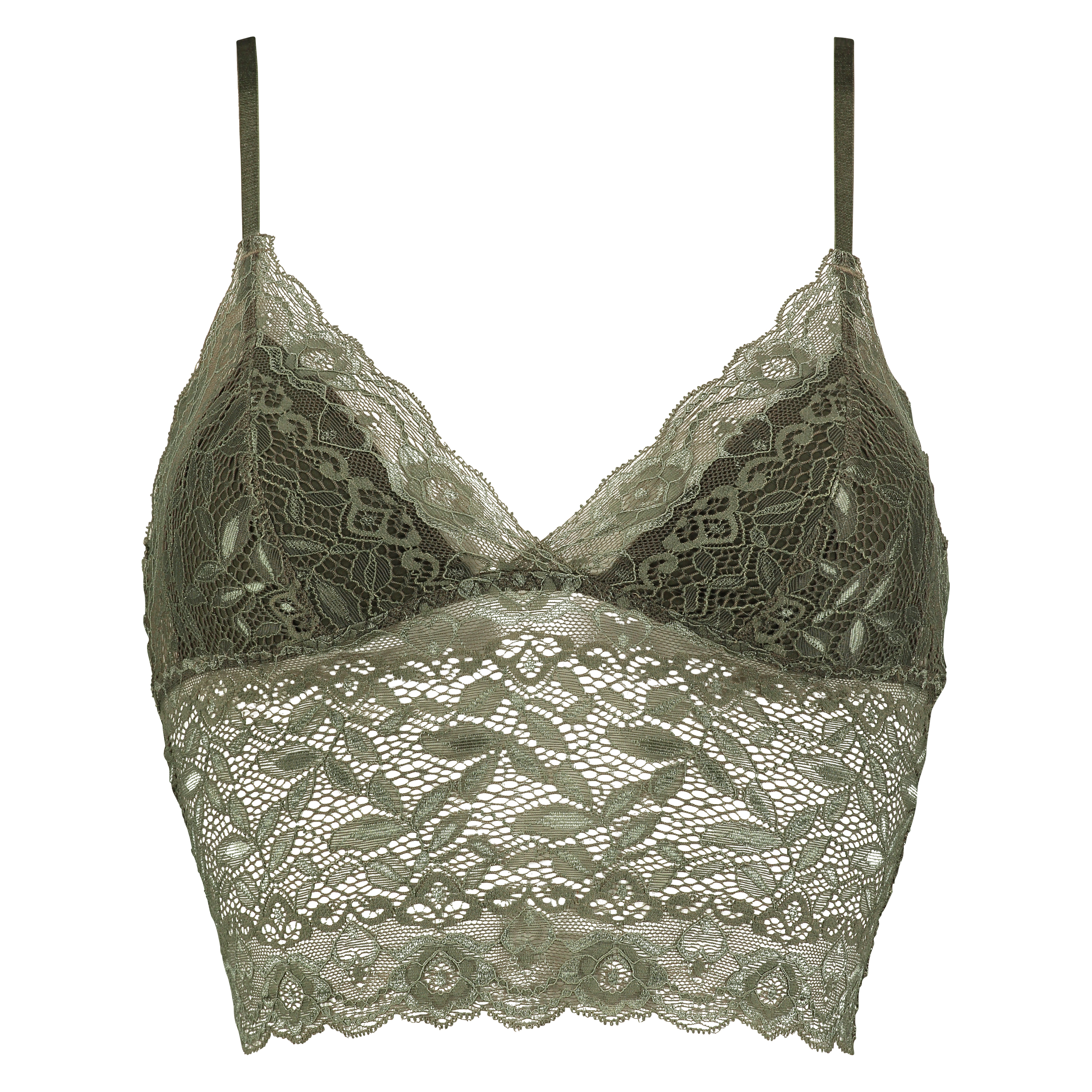 This sexy longline bralette features beige sem-transparent lace with an extra layer of lace on the cups. The shoulder straps are adjustable.