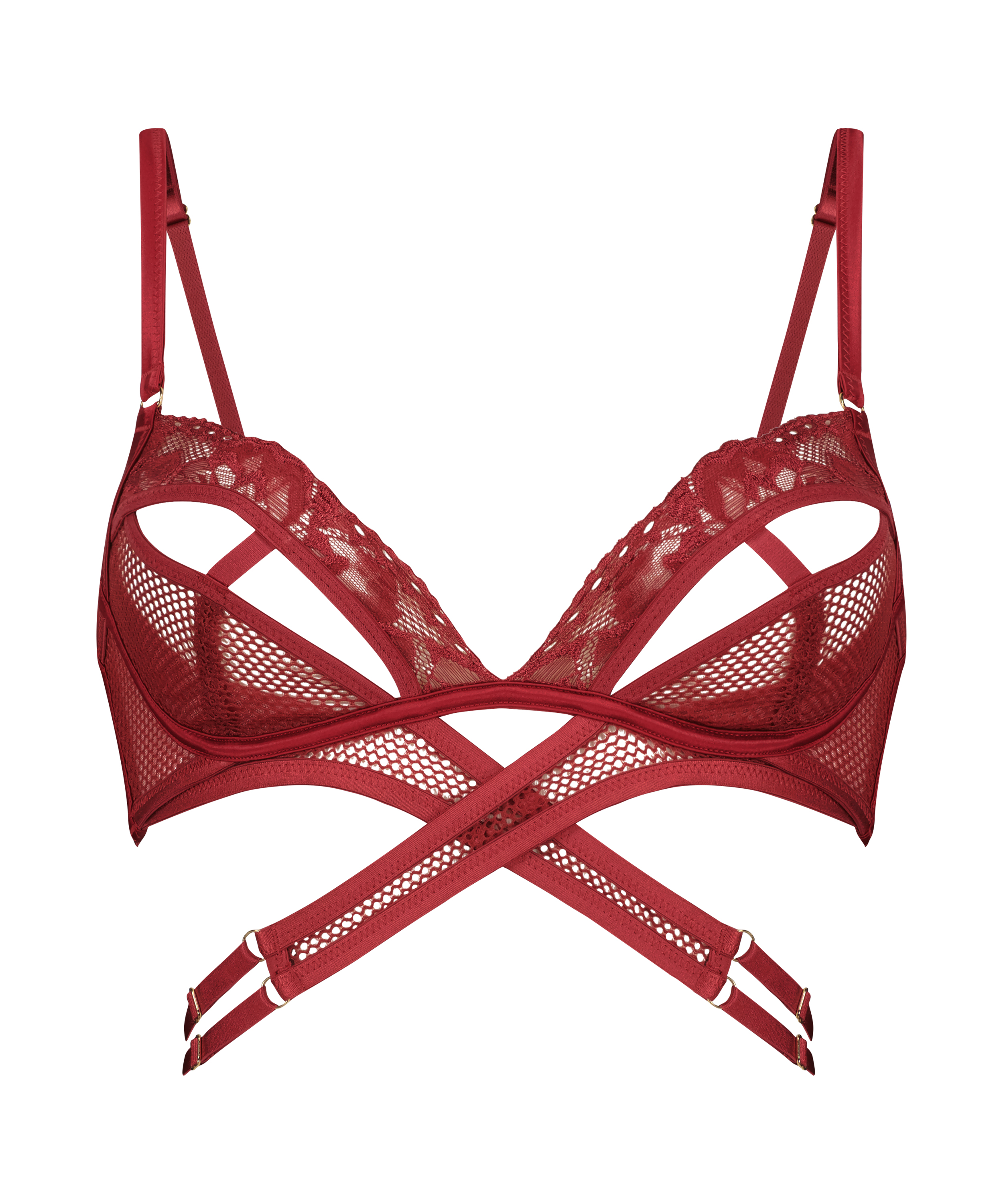 Pift tingene op med denne superfrække bralette. Den har masser af fishnet- og snoredetaljer overalt. Der er udskæringer på skålene og på taljebåndet. Den har et helt særligt look. Sæt den sammen med matchende trusser! En del af vores Private-kollektion.