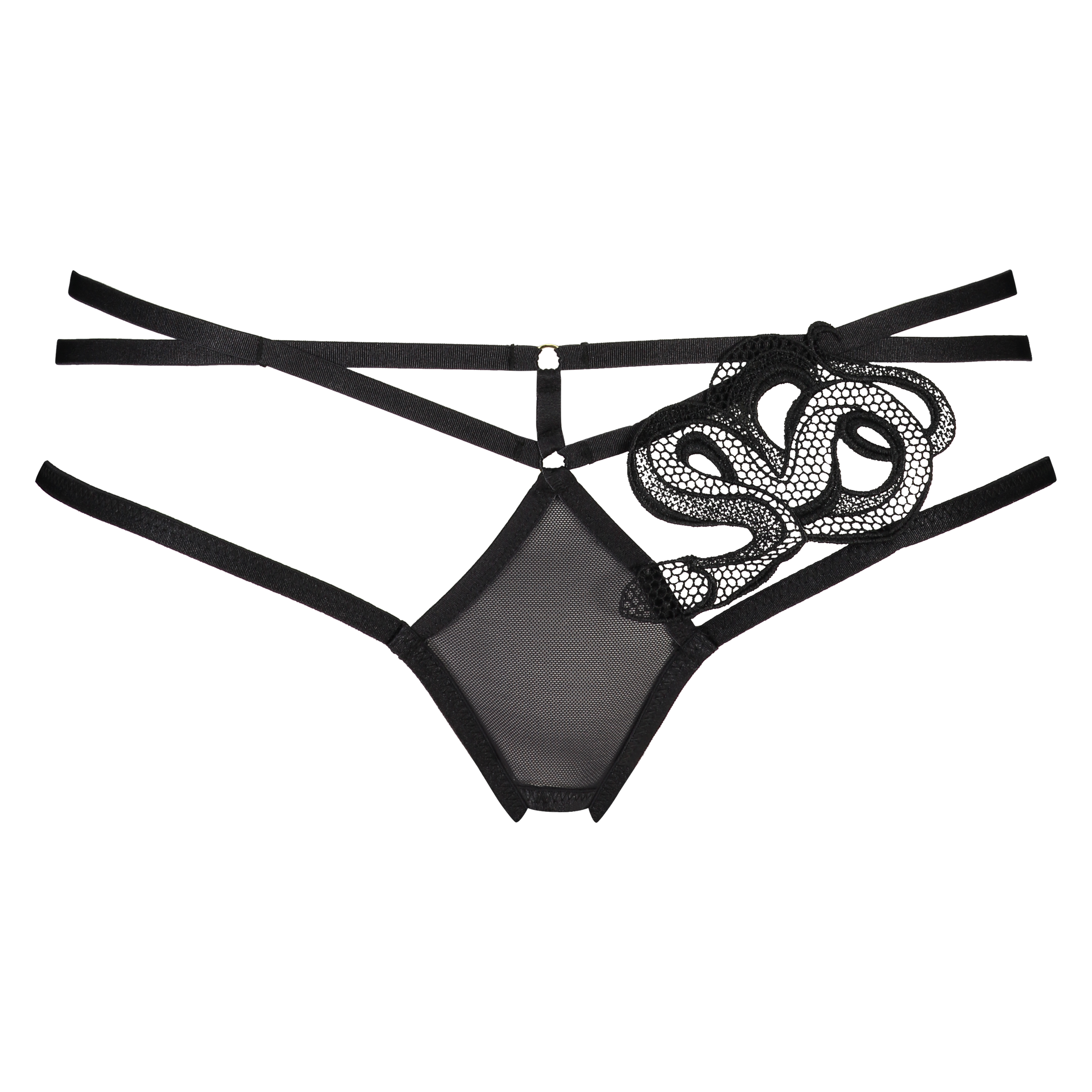 Er dette for vovet? Denne spændende brasilianske trusse er fra vores Private-kollektion. Den brasilianske trusse er bundløs, har mange stropper og er forsynet med en slange på forsiden. Sæt den sammen med en passende bh.
