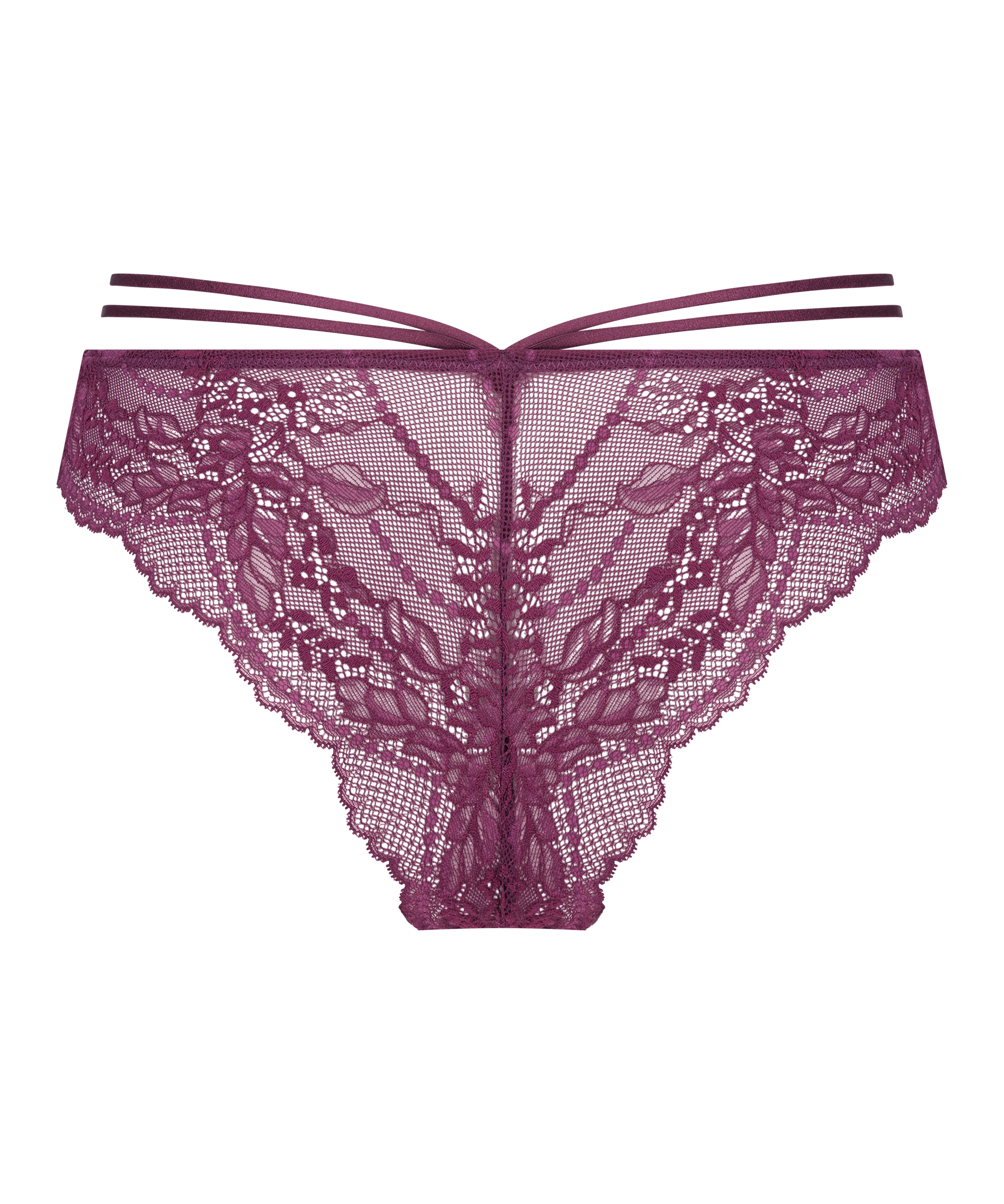 Gå efter et stilfuldt look med denne brasilianske trusse! Den er næsten helt lavet af blonder og har fine stropper foroven. Kombiner med din yndlings-bh i samme farve!