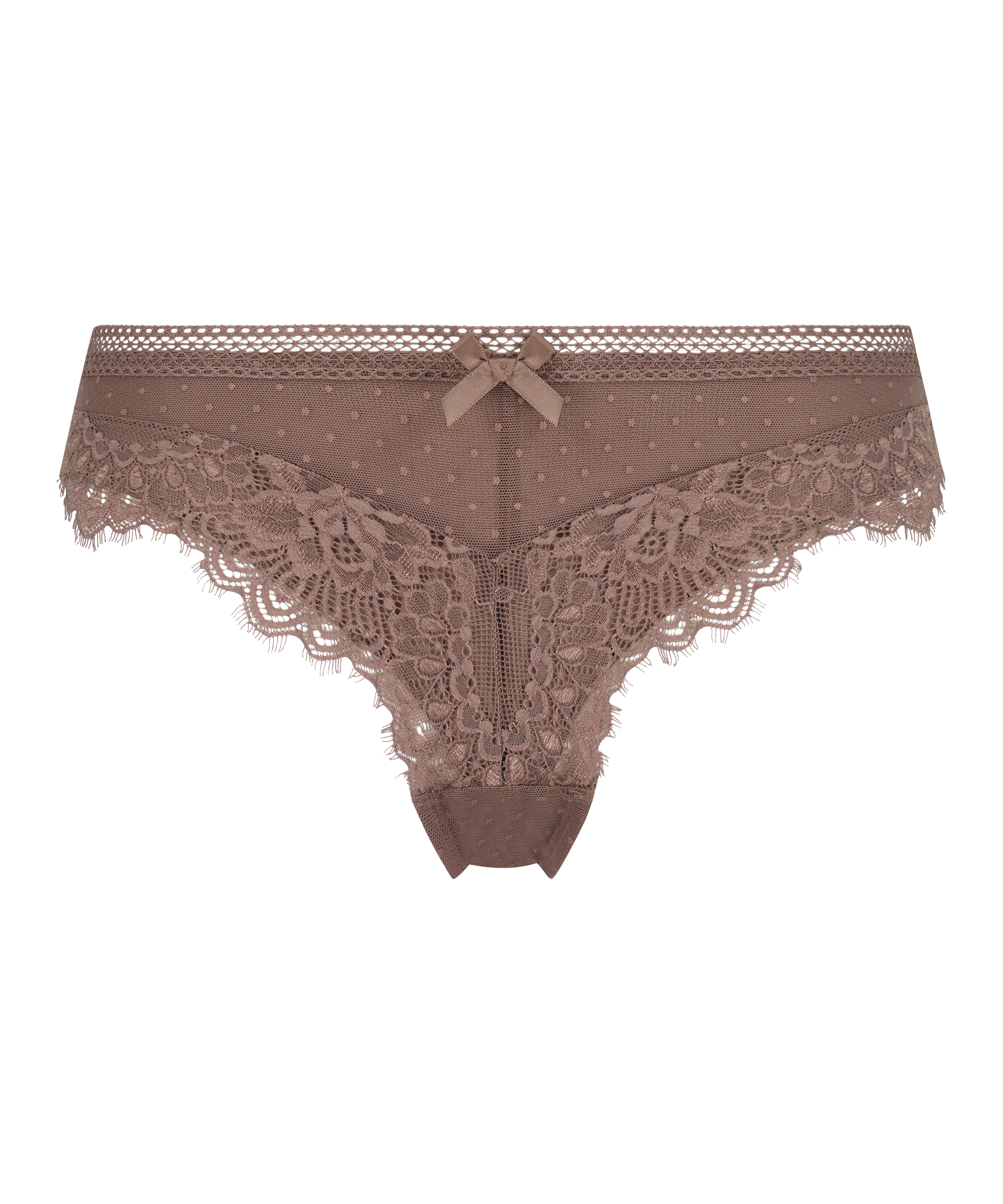 Leder du efter en yndefuld brasiliansk trusse? Så er denne det perfekte valg for dig! Den er næsten helt dækket af blonder og prikket print. Der er en lille sløjfe foran. Kombiner denne brasilianske trusse med den matchende bh for at fuldende sættet!
