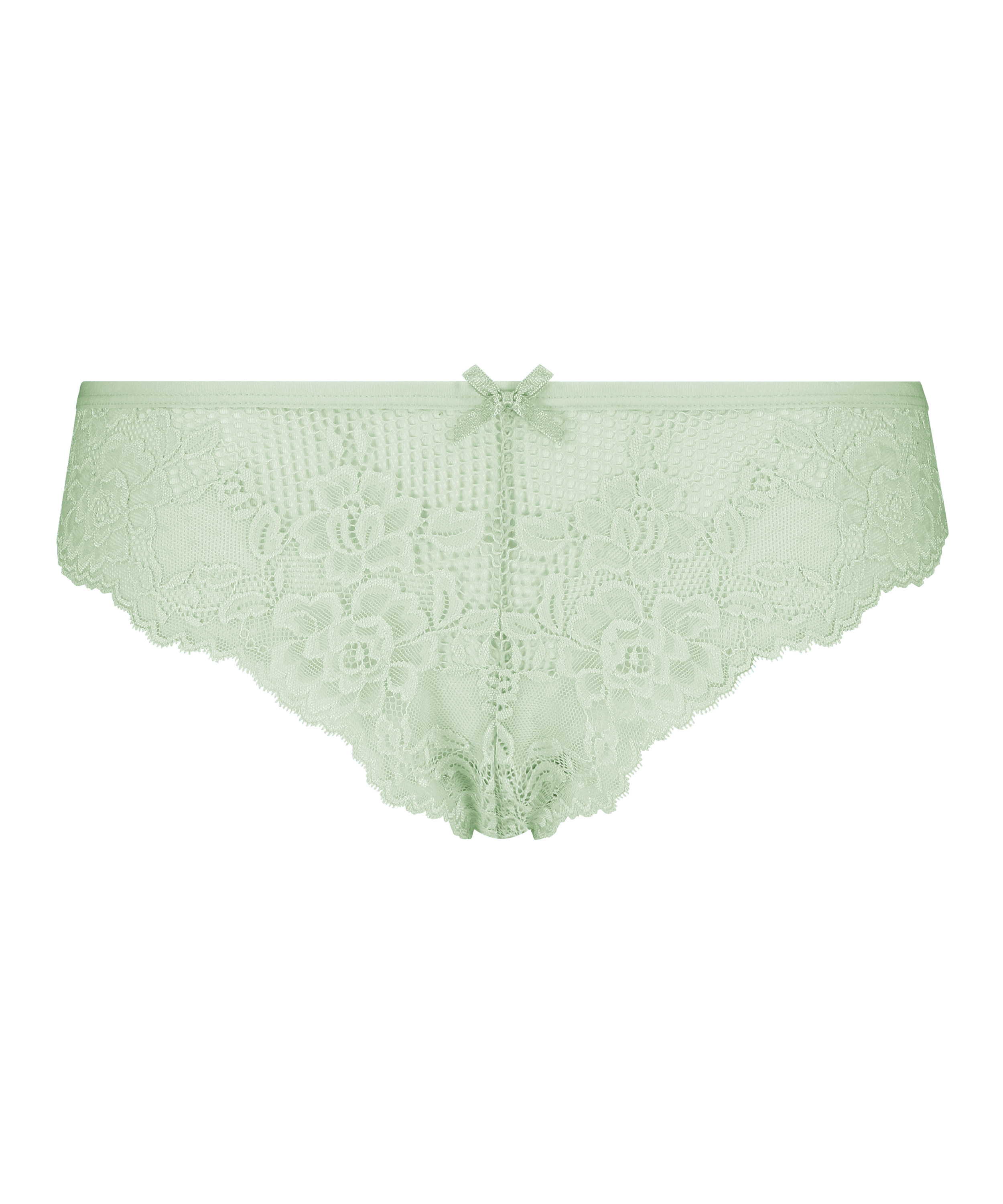 Denne brasilianske trusse er halvtransparent og med masser af blondestof. Den lille sløjfe foran fuldender den!