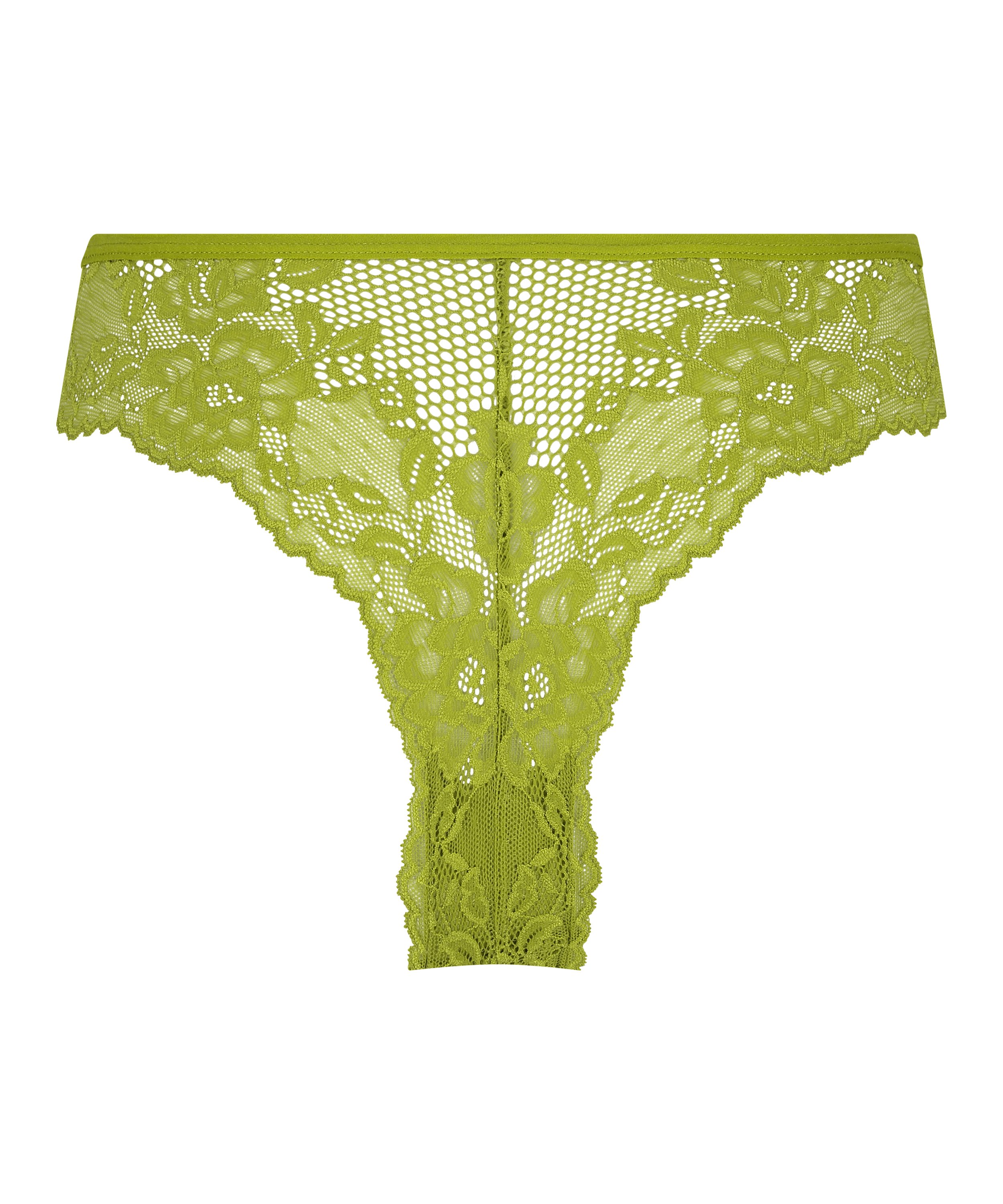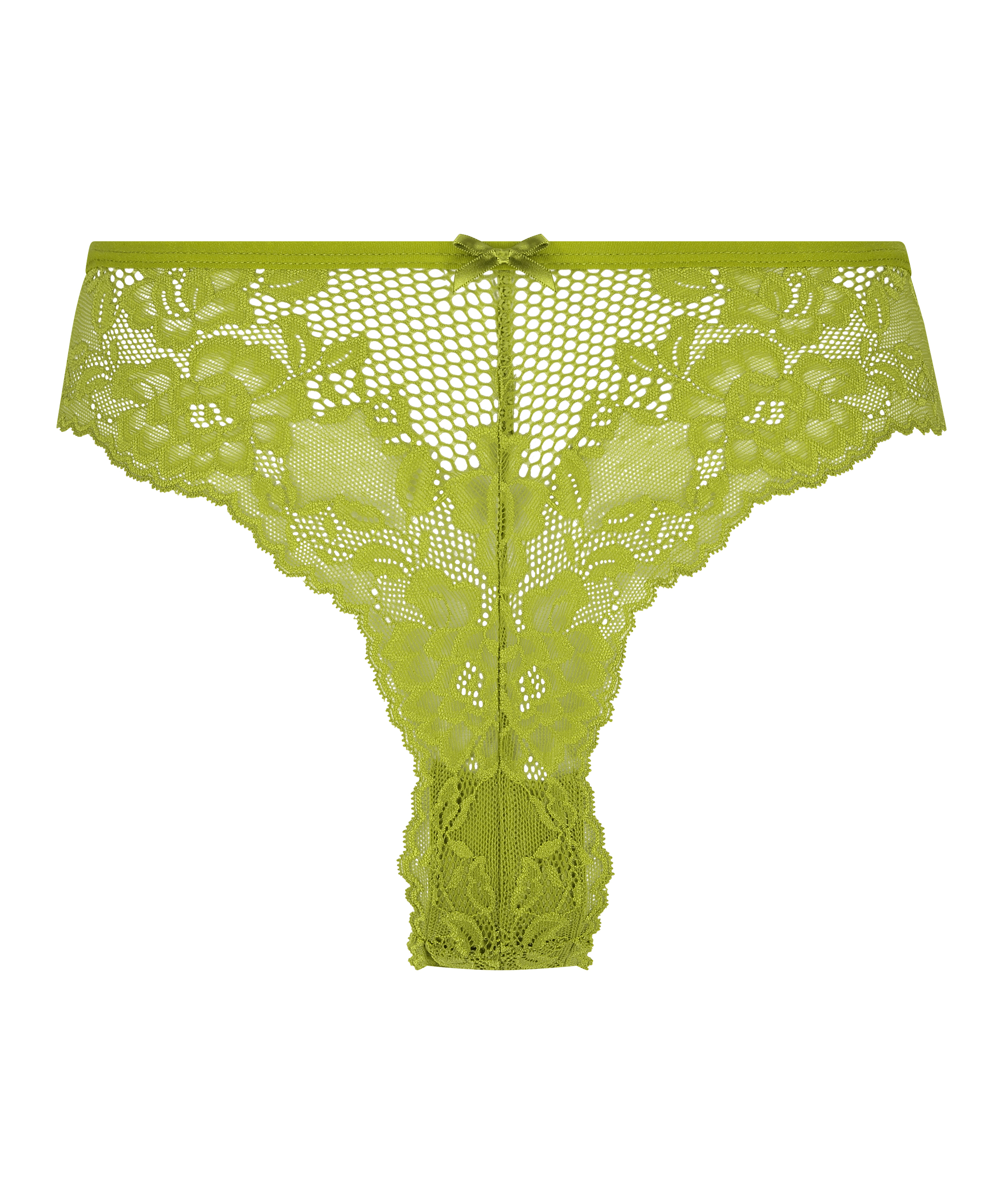 Denne brasilianske trusse er forsynet med glitrende blonder i et blomstermønster. Sløjfen runder denne brasilianske trusse fint af! Kombinér med den matchende bh for det komplette sæt!