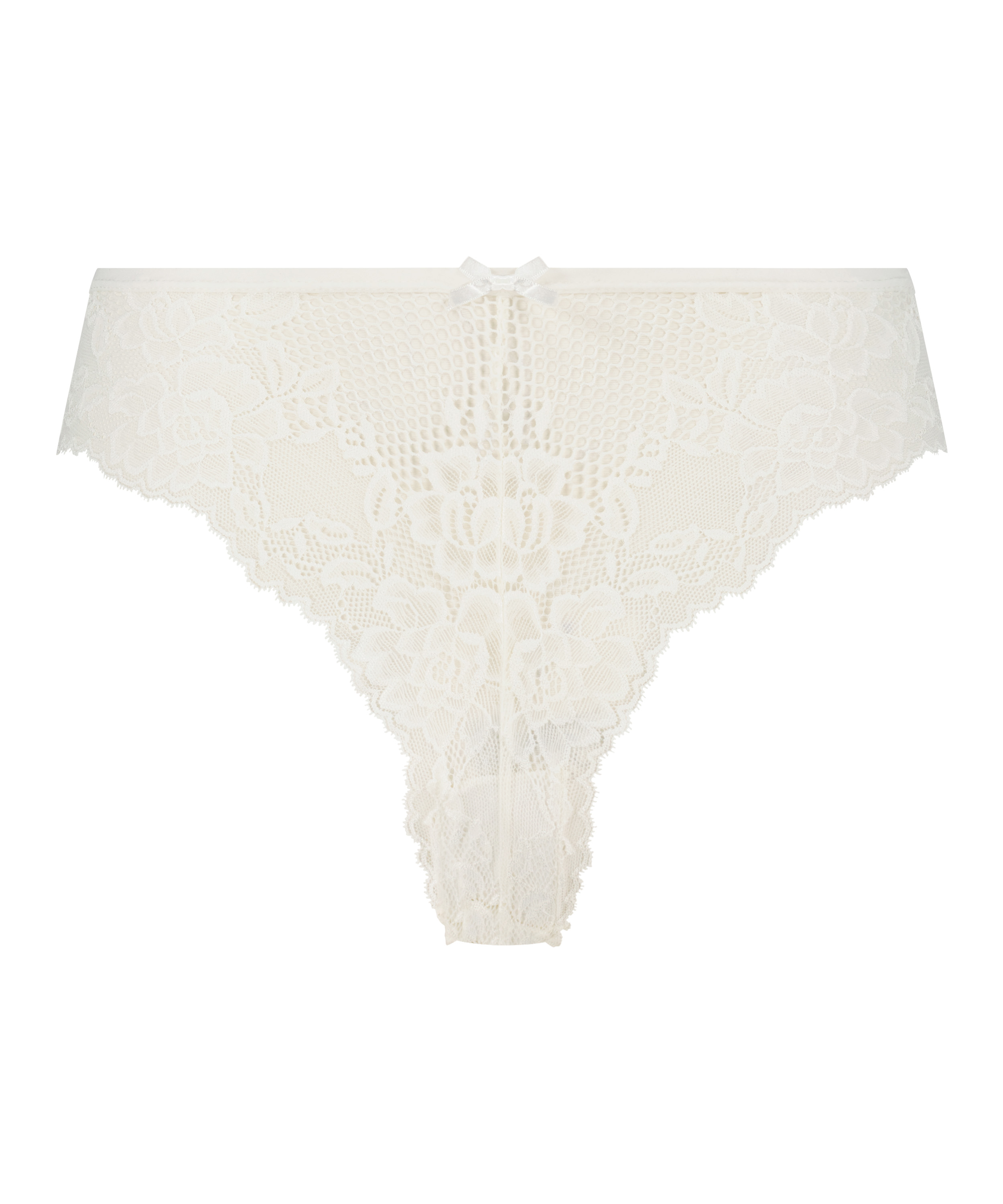 Denne brasilianske trusse er halvtransparent og med masser af blondestof. Den lille sløjfe foran fuldender den!
