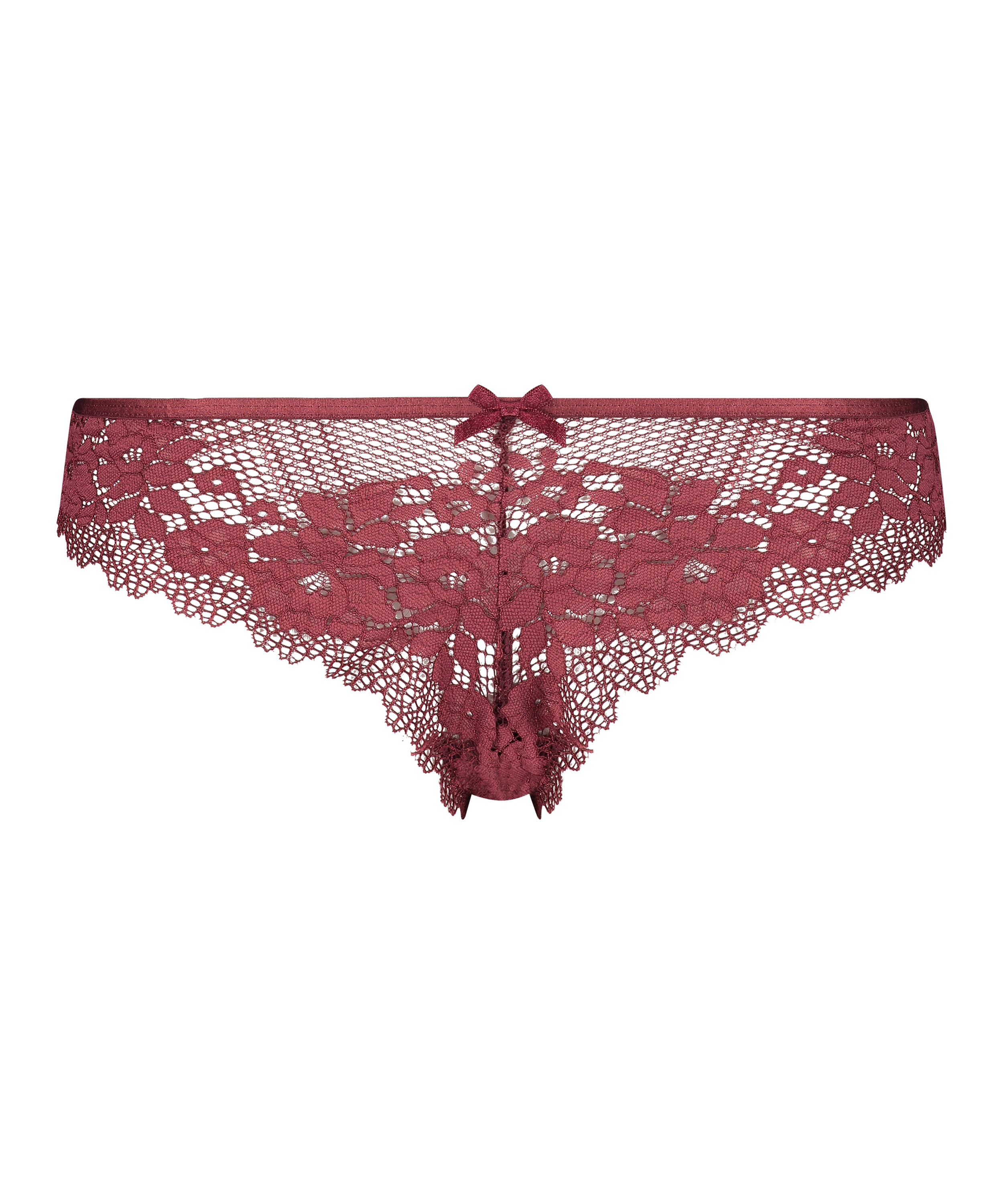Denne brasilianske trusse er så smuk! Den er næsten helt dækket med blonder og fishnet. Foran er den forsynet med en yndig sløjfe.