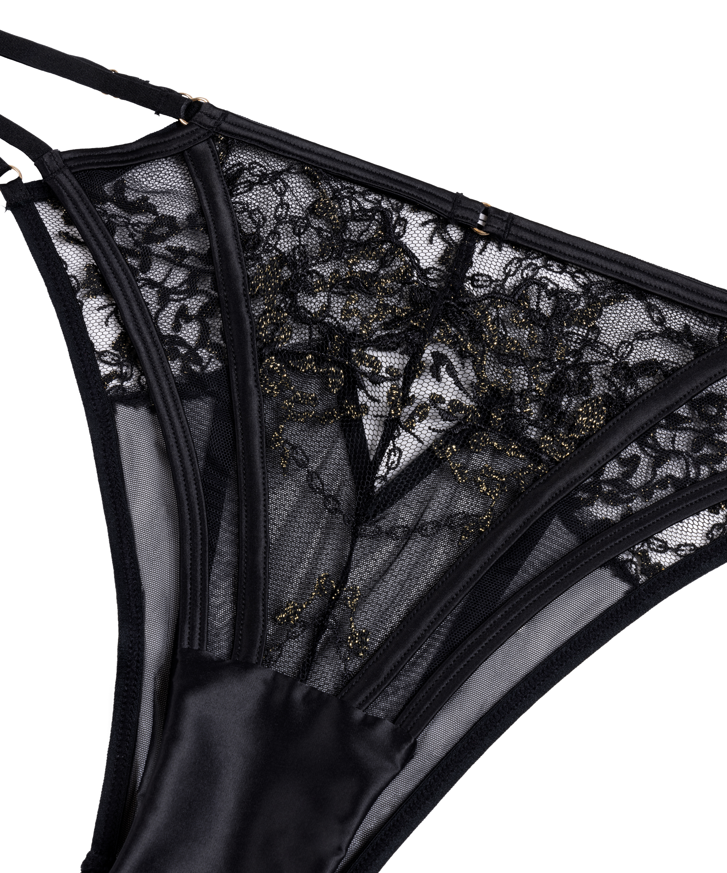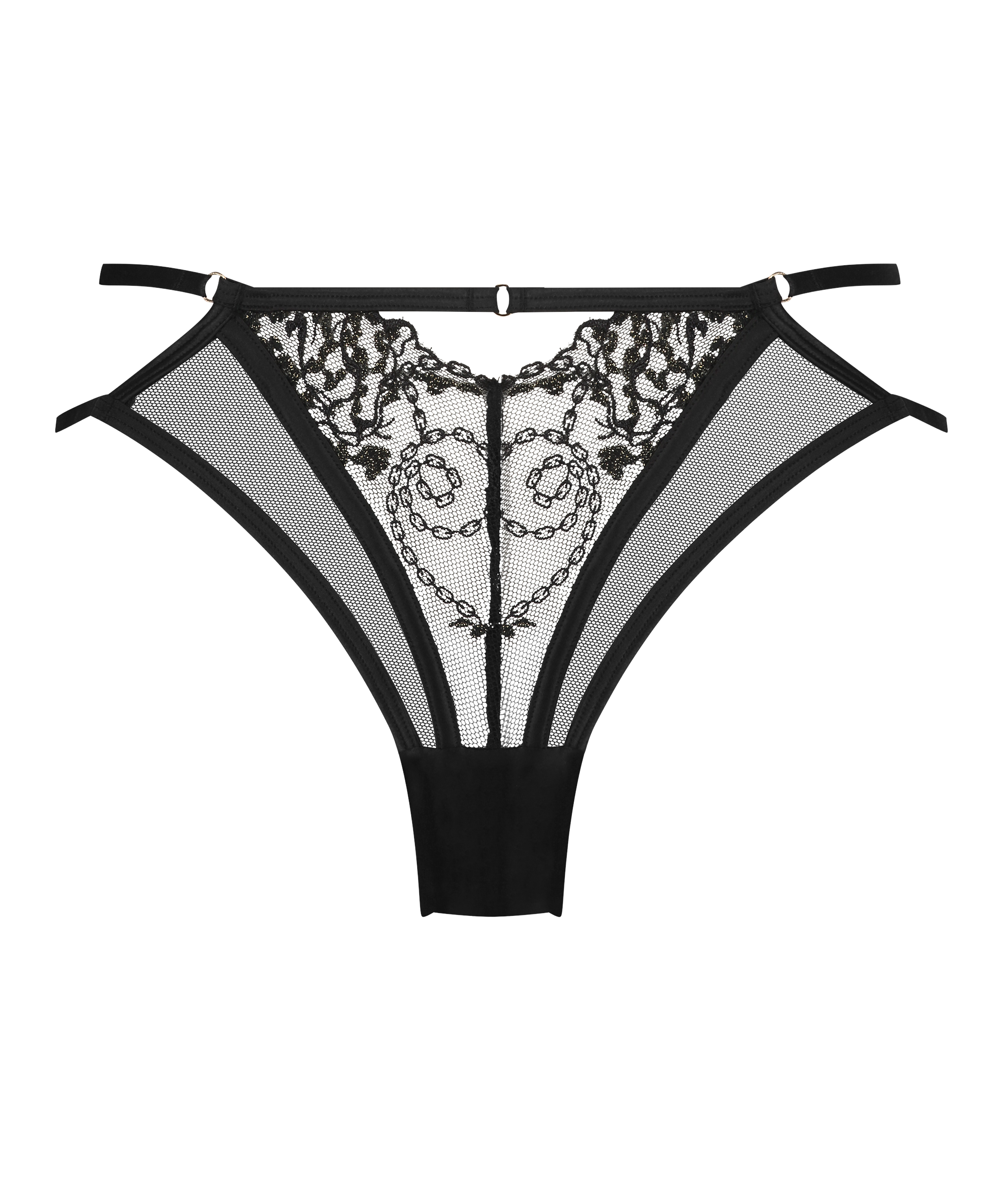 Sæt ekstra krydderi på tingene med denne brasilianske trusse! Denne brasilianske trusse har udskårne detaljer og masser af smukke blonder. Kombiner med matchende dele. En del af vores Private-kollektion.