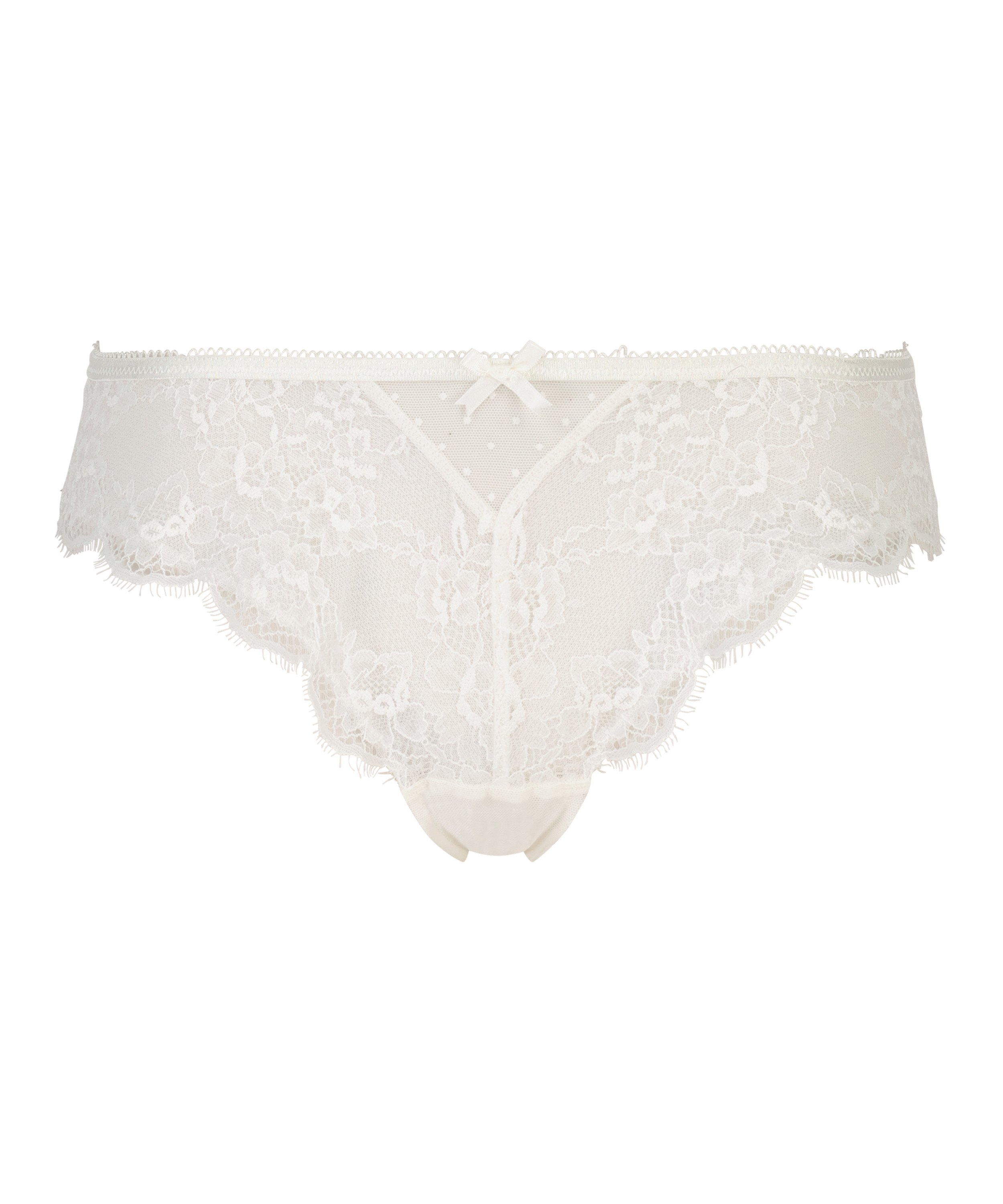 Strål i denne smukke brasilianske trusse! Den er lavet af blonder og mesh og er forsynet med en yndig sløjfe. Kombiner med passende modeller for at få et komplet sæt!