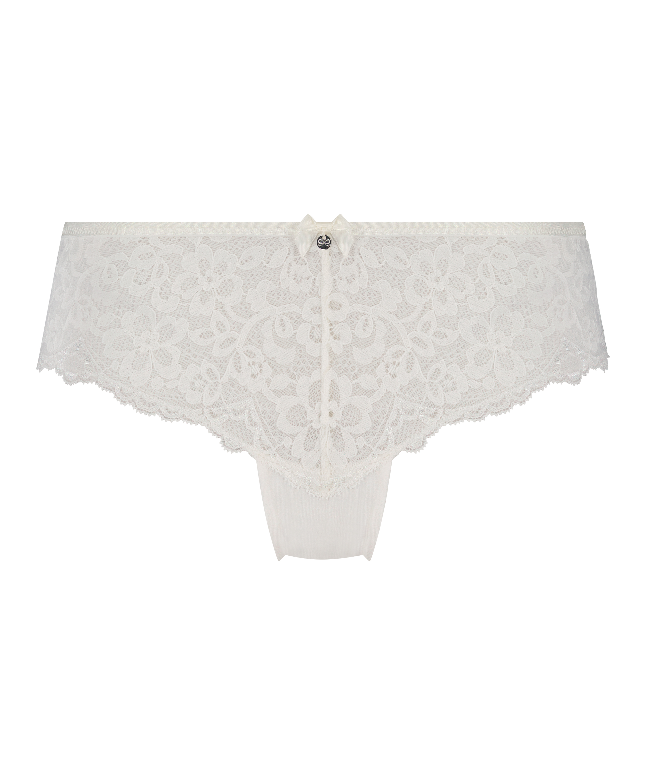 Denne brasilianske trusse er helt beklædt med blondestof, som er supersexet! Den er også pyntet med en lille sløjfe i midten. Kombiner med den matchende bh for et fuldendt look!