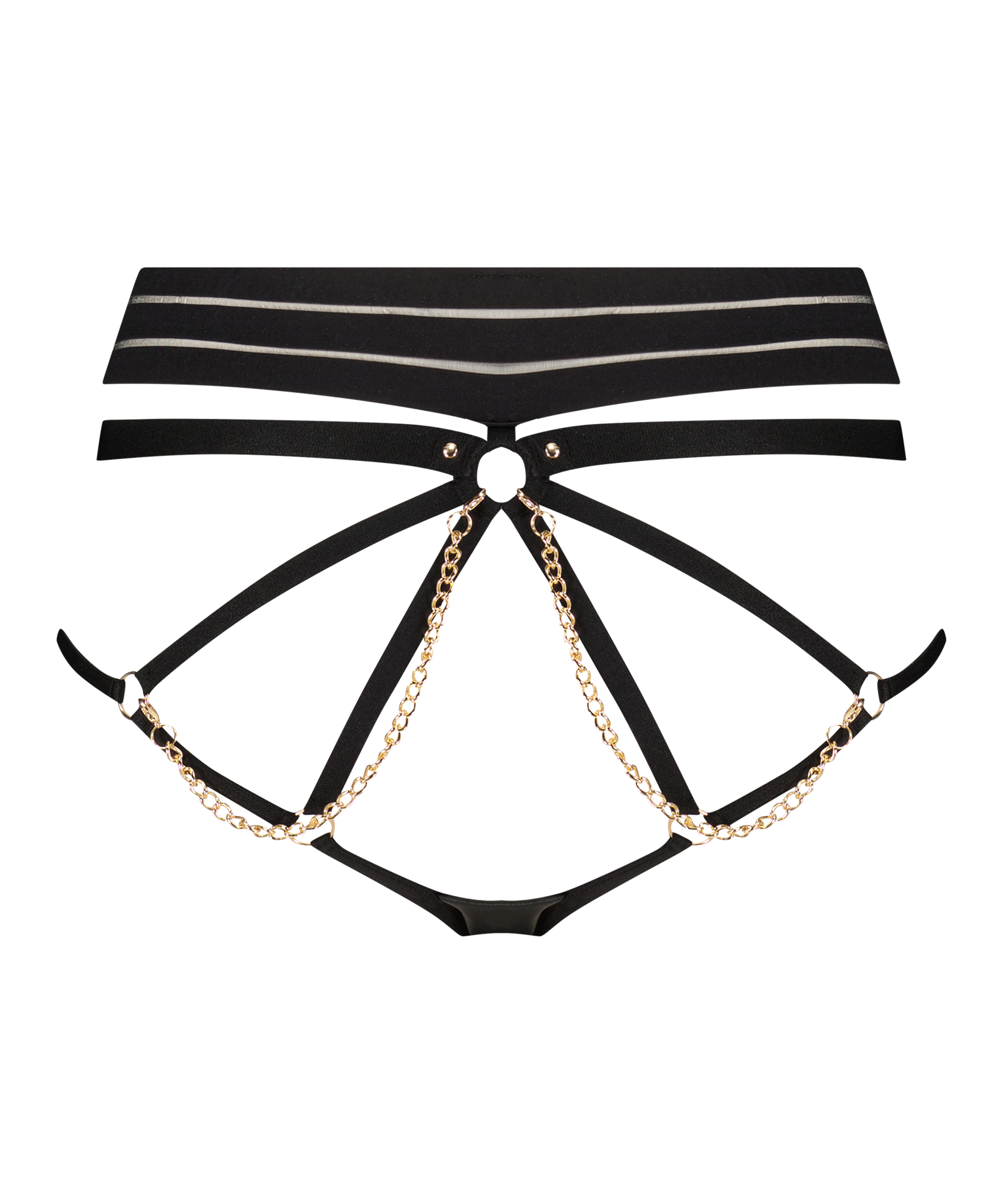 Tag dit lingerisæt til næste niveau med denne super sexede brasilianske trusse! Pyntet med stropdetaljer og aftagelige guldkæder for et frækt look. Der er en udskåren detalje på ryggen og G-stengen er pyntet med en aftagelig guldkæde. Sæt den sammen med Hecate bustier for at fuldende sættet!