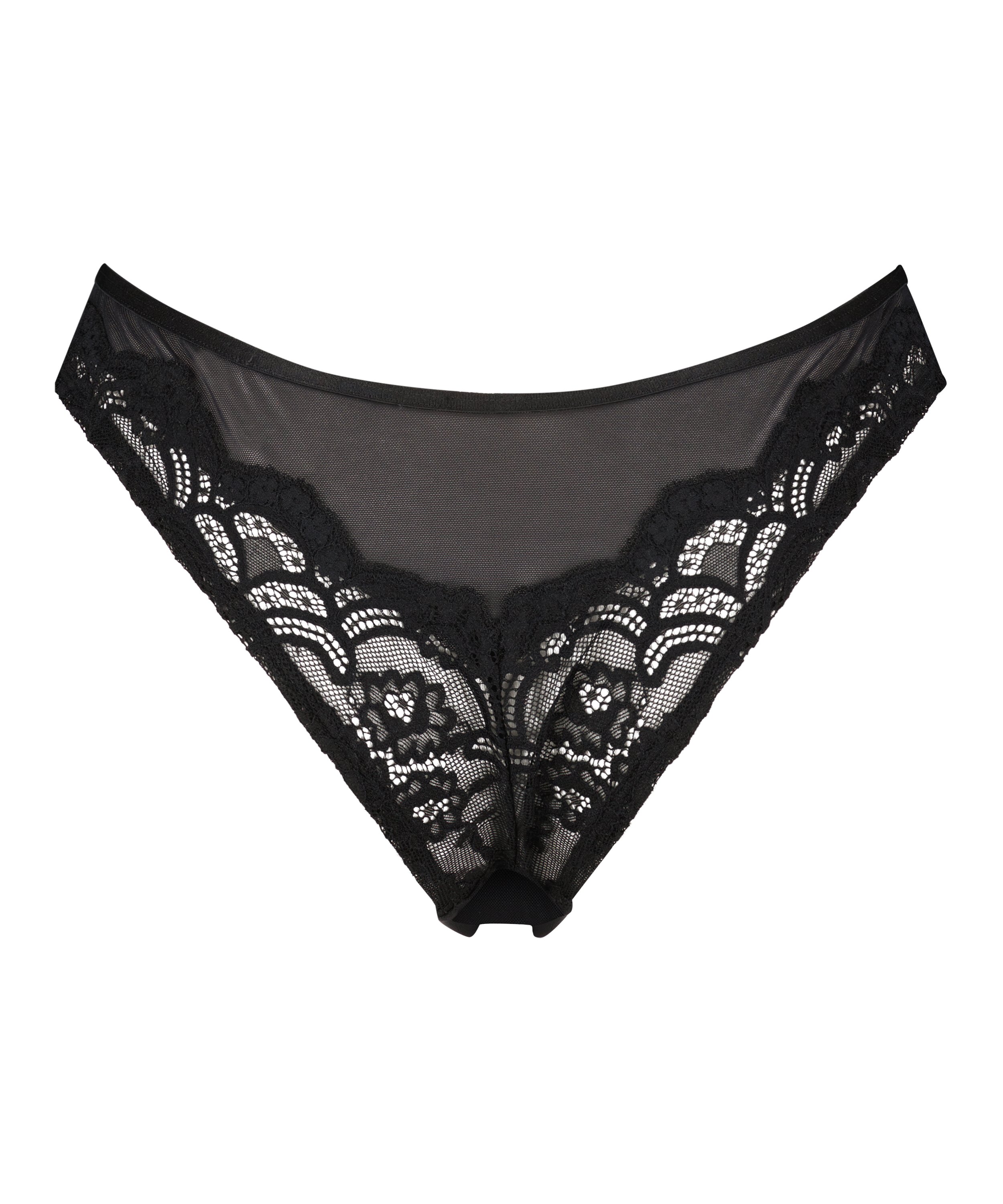 Denne dejlige brasilianske trusse lader dine ben komme helt til deres ret! Denne brasilianske trusse har en pasform med højt udsnit og er forsynet med smukke blondedetaljer. Trussen er halvgennemsigtig og derfor super sexet. Kombiner den med en passende bh.