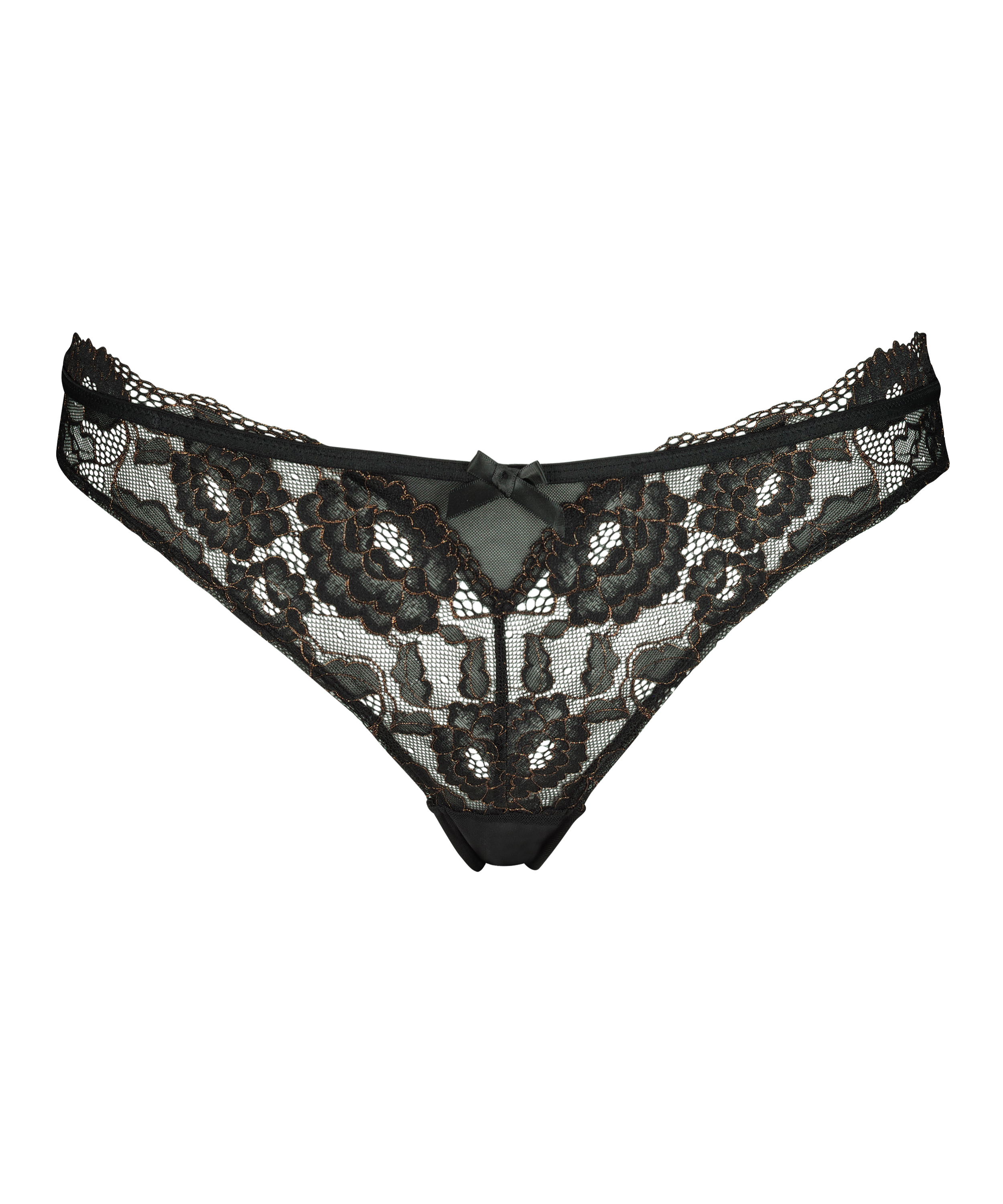 Strål i denne brasilianske trusse! Den brasilianske trusse er udskåret højt og forsynet med smukke og luksuriøse detaljer af blonder og mesh.Sløjfen foran runder den fint af!