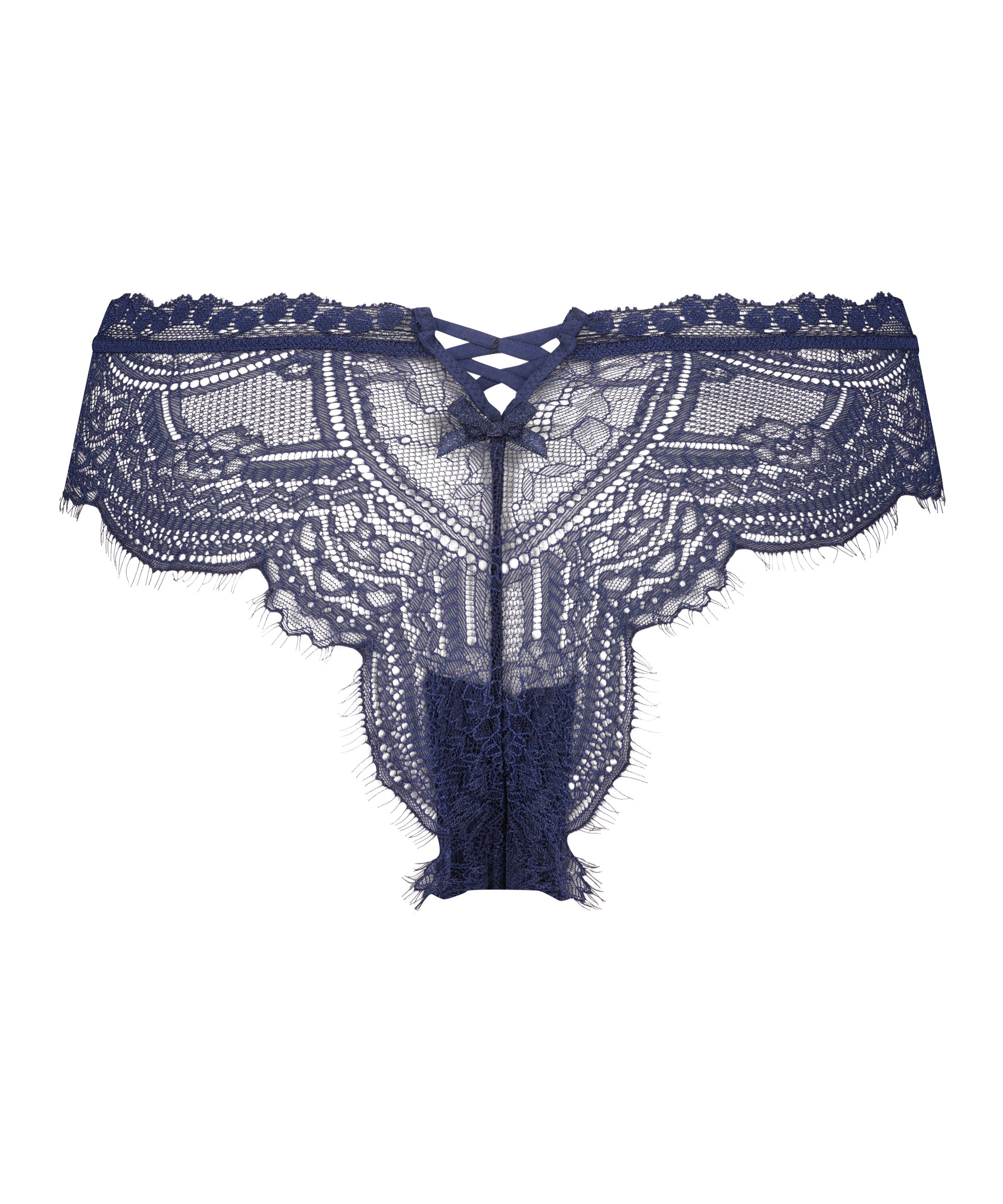 Denne brasilianske trusse er bare sød! Blondestof og sløjfe på forsiden fuldender den helt. Kombiner med din yndlings-bh for at komme til at se super sød ud!