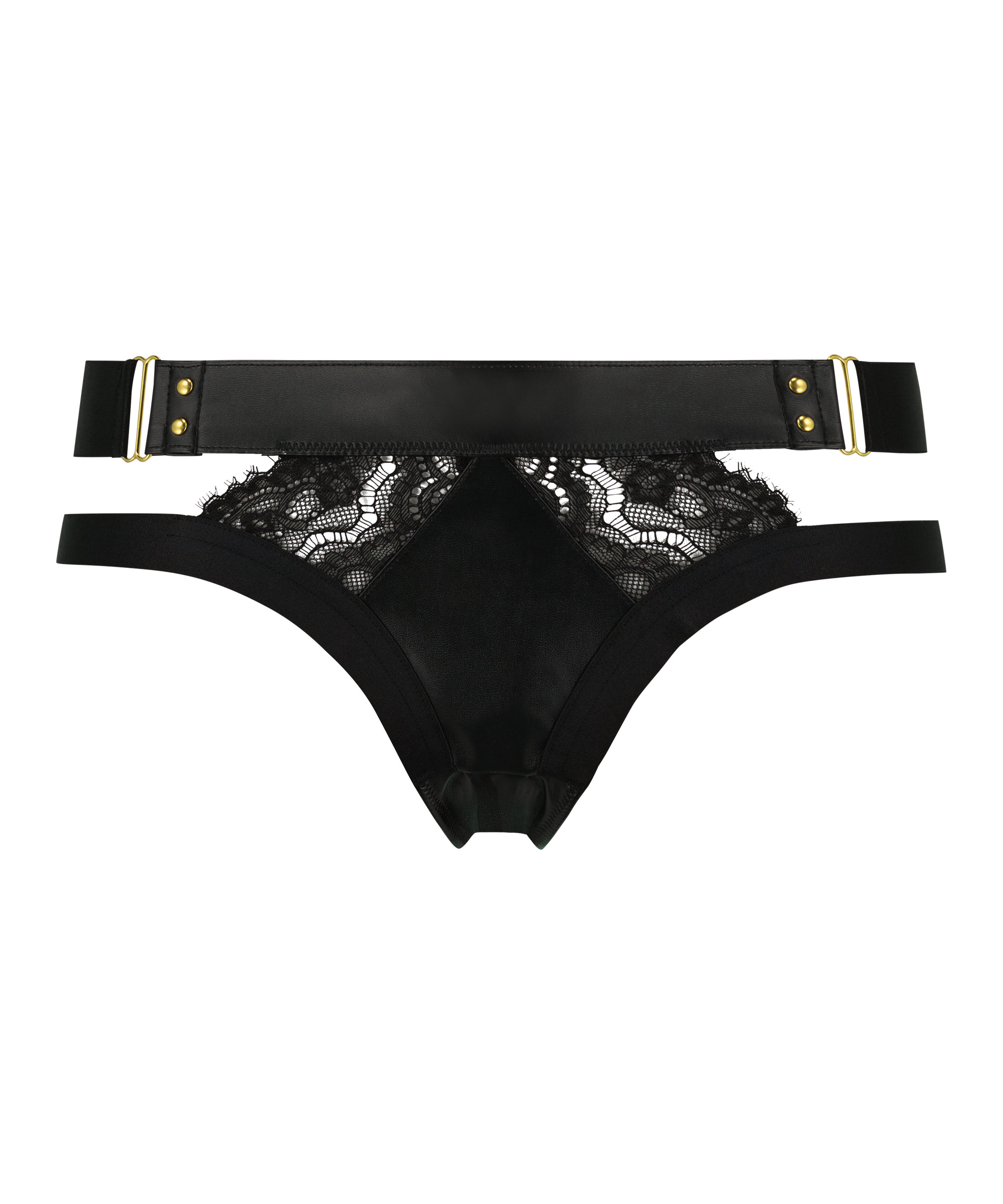 Klar til en spændende aften? Så er denne brasilianske trusse perfekt! Med læder-look og delvist beklædt med blonder. Med et tykt taljebånd for en behagelig pasform og detaljer med stropper på hofterne. Kombiner den med den matchende bh fra vores Private Collection!
