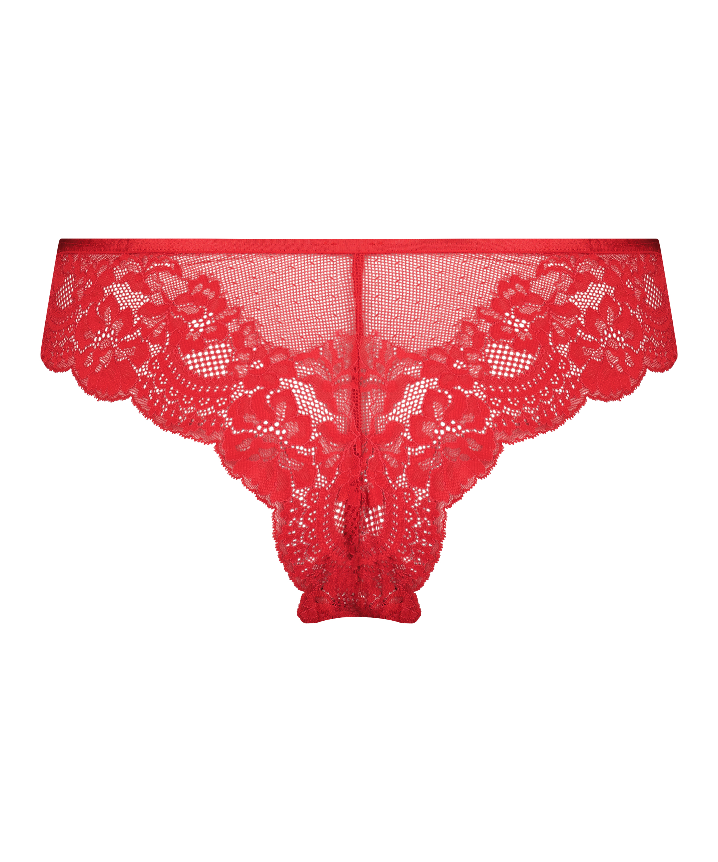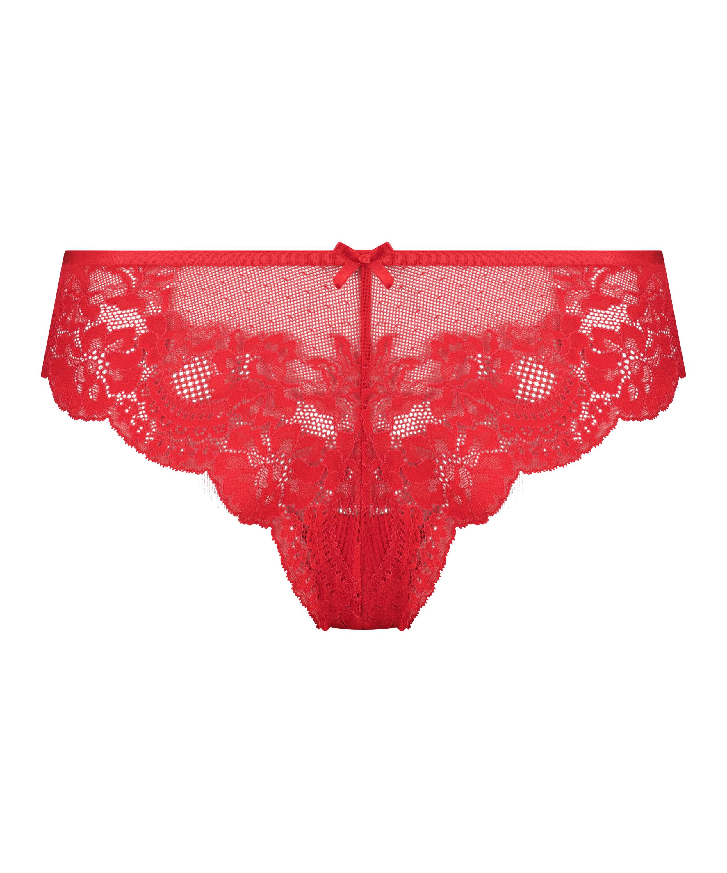 Kom til at se sexet ud med denne brasilianske trusse. Den er lavet af halvgennemsigtige blonder, og sløjfen foran er en fin prik over i’et. Kombiner med din egen yndlings-bh!