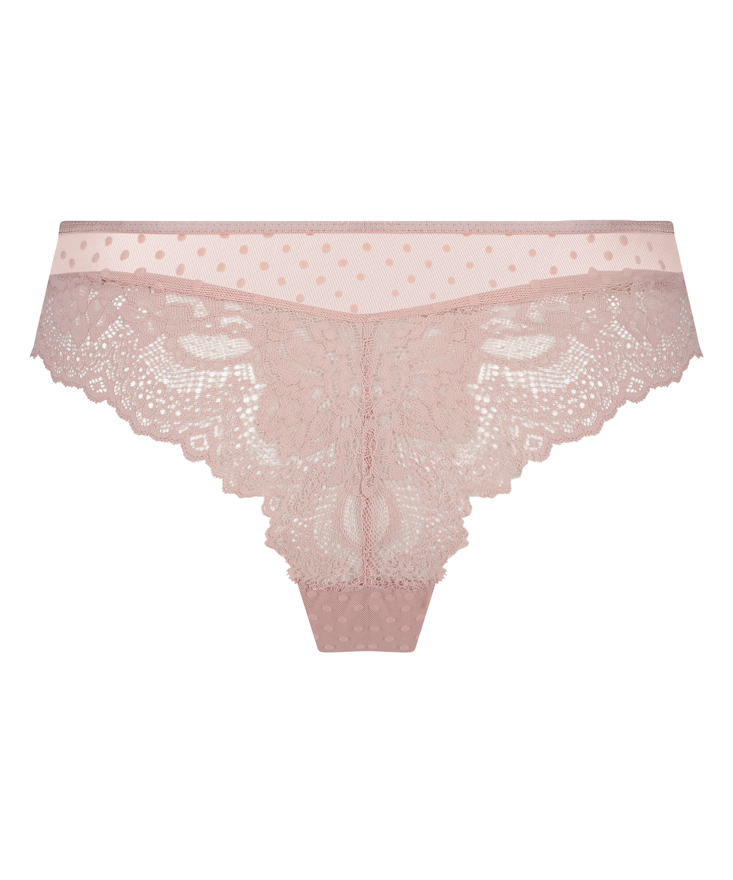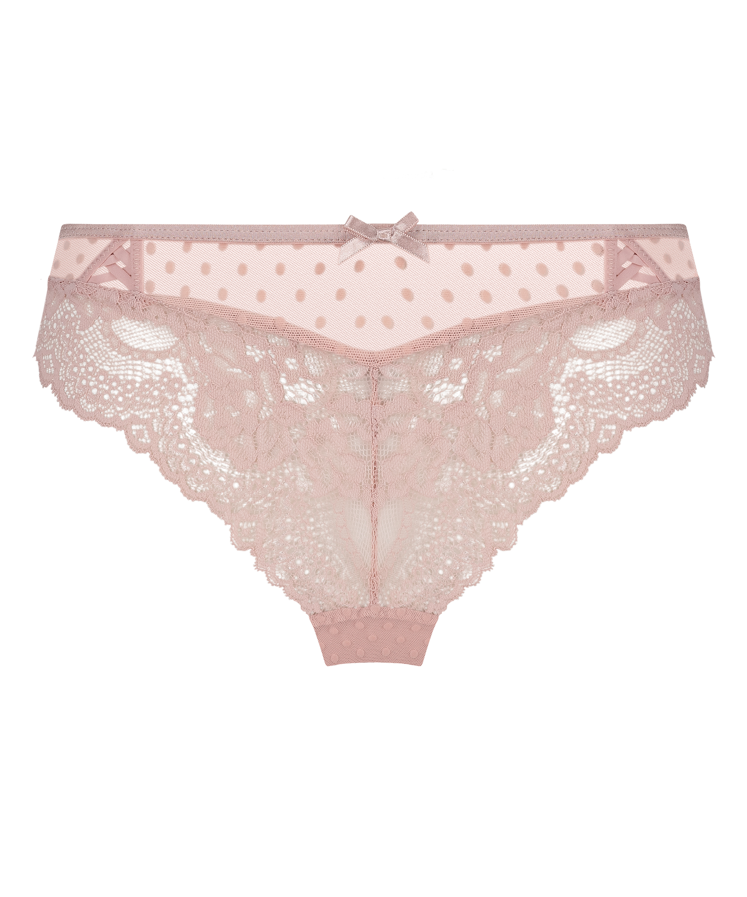 Denne brasilianske trusse er bare sød! Den indeholder både blonder og mesh og har en sød sløjfe foran. Kombiner med din yndlings-bh for at få et sødt sæt!