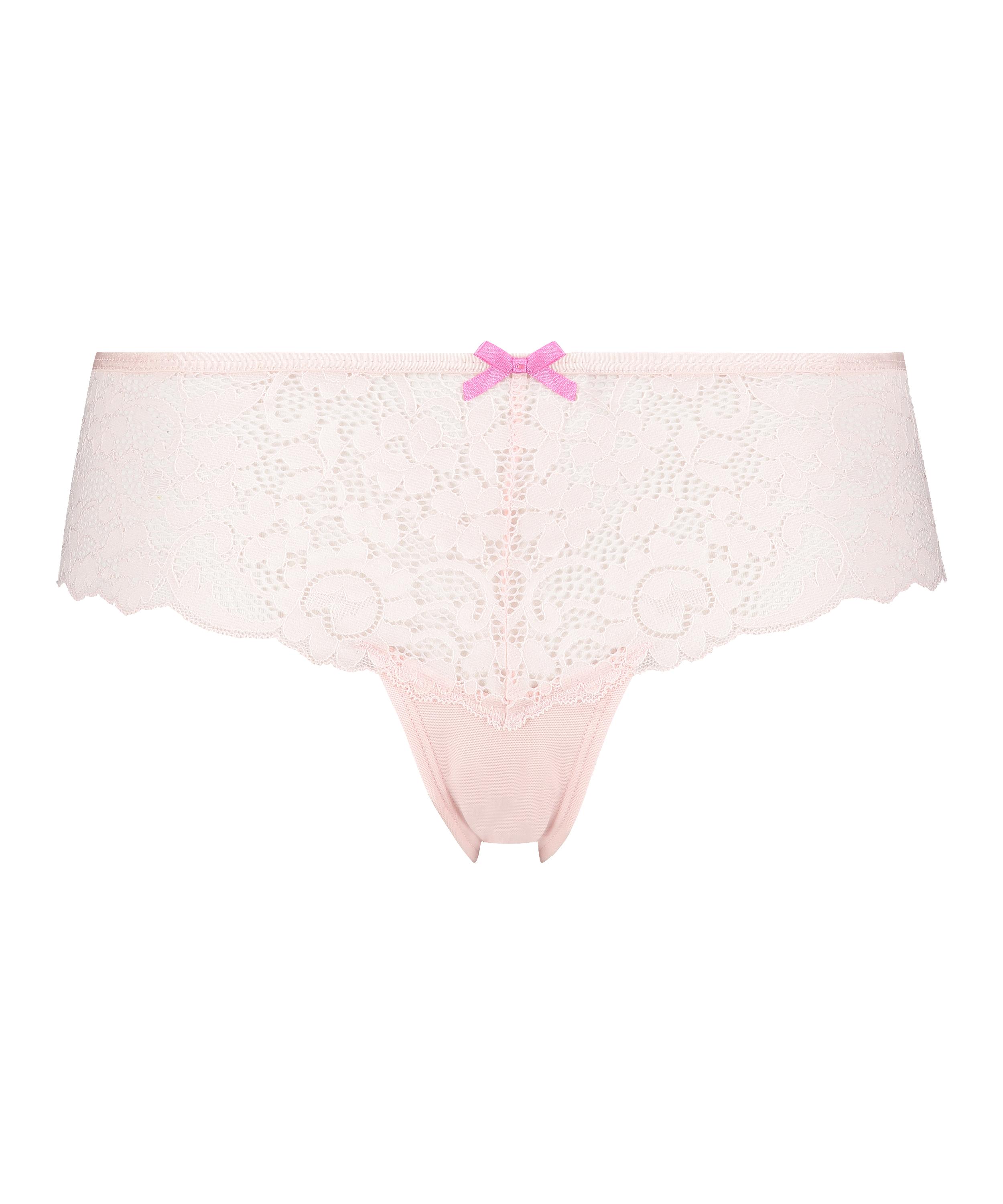 Stjæl showet i disse brasilianske shorts! De er næsten udelukkende lavet af blonder med blomsterprint. På forsiden er placeret en lille sløjfe. Den sidder lidt højere og derfor mere behagelig. Let at kombinere med bh'er i samme farve!