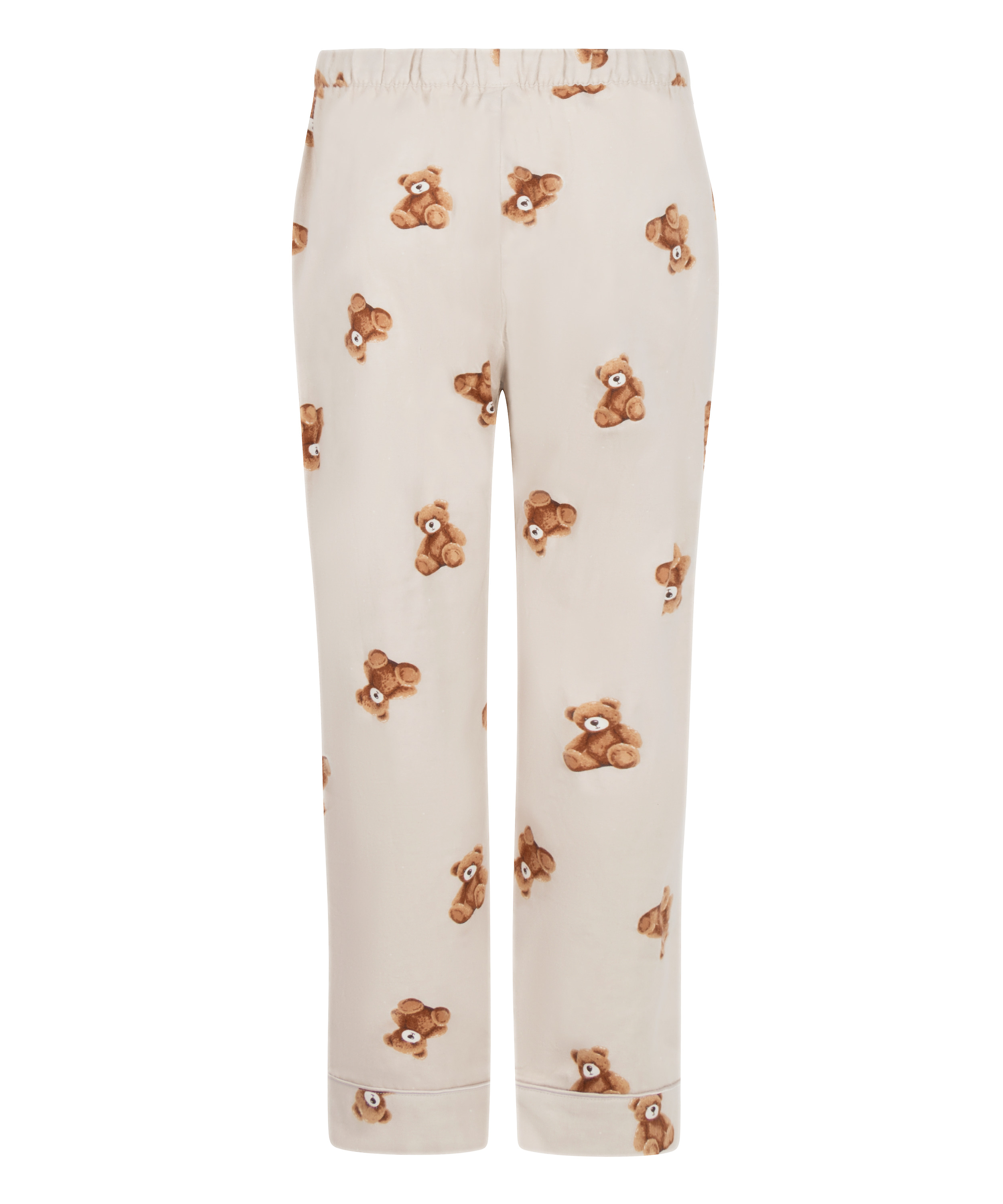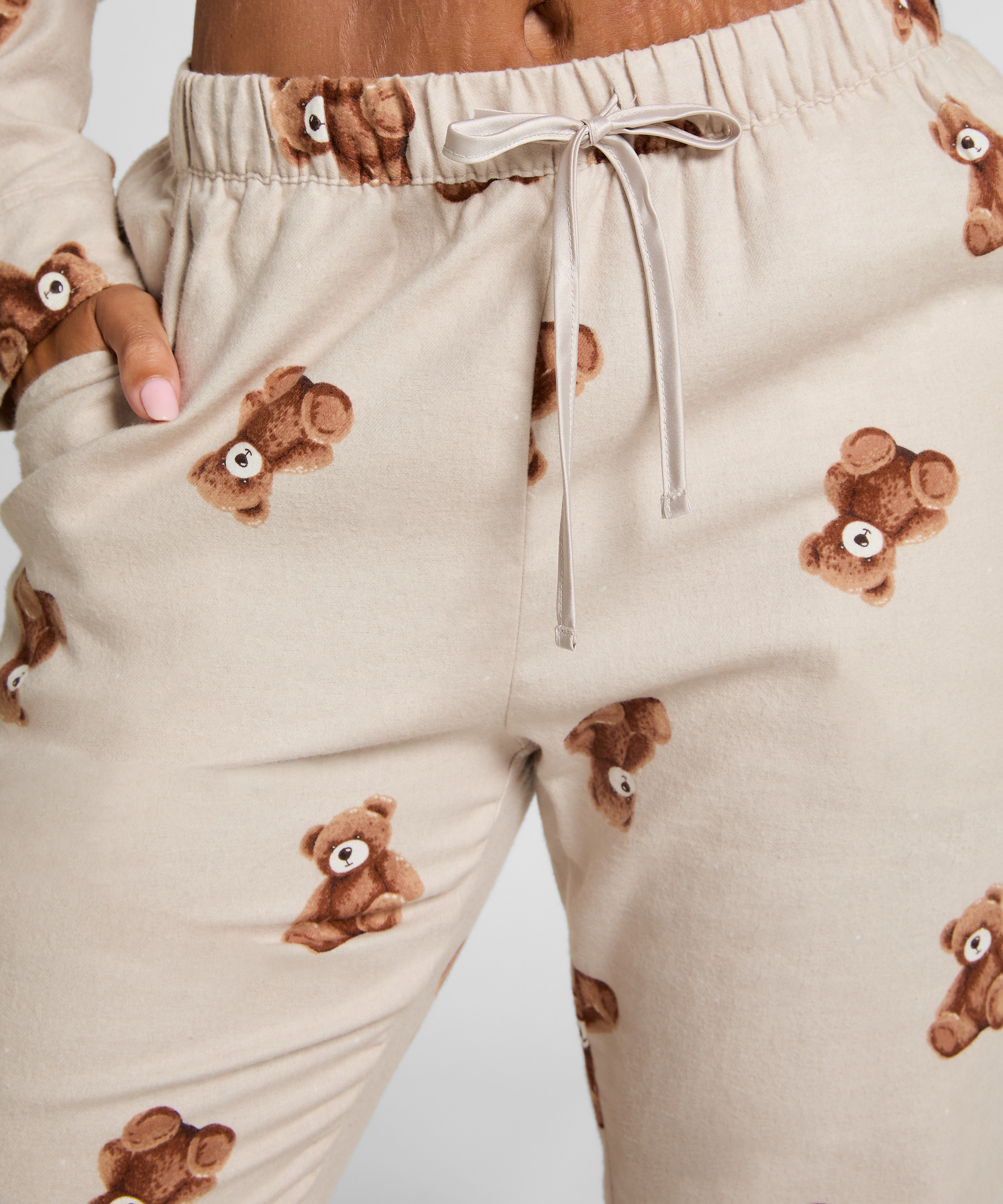 Kryb ind i disse bløde pyjamasbukser i flanelstof — designet med komfort for øje og et livligt twist. Stoffet føles varmt og blødt mod huden, mens den afslappede pasform og den justerbare snøre i taljen giver dig fri bevægelighed. De har et heldækkende bjørneprint og tilføjer et sjovt touch til din sengetidsrutine. Kombinér med den matchende jakke for et fuldendt look.