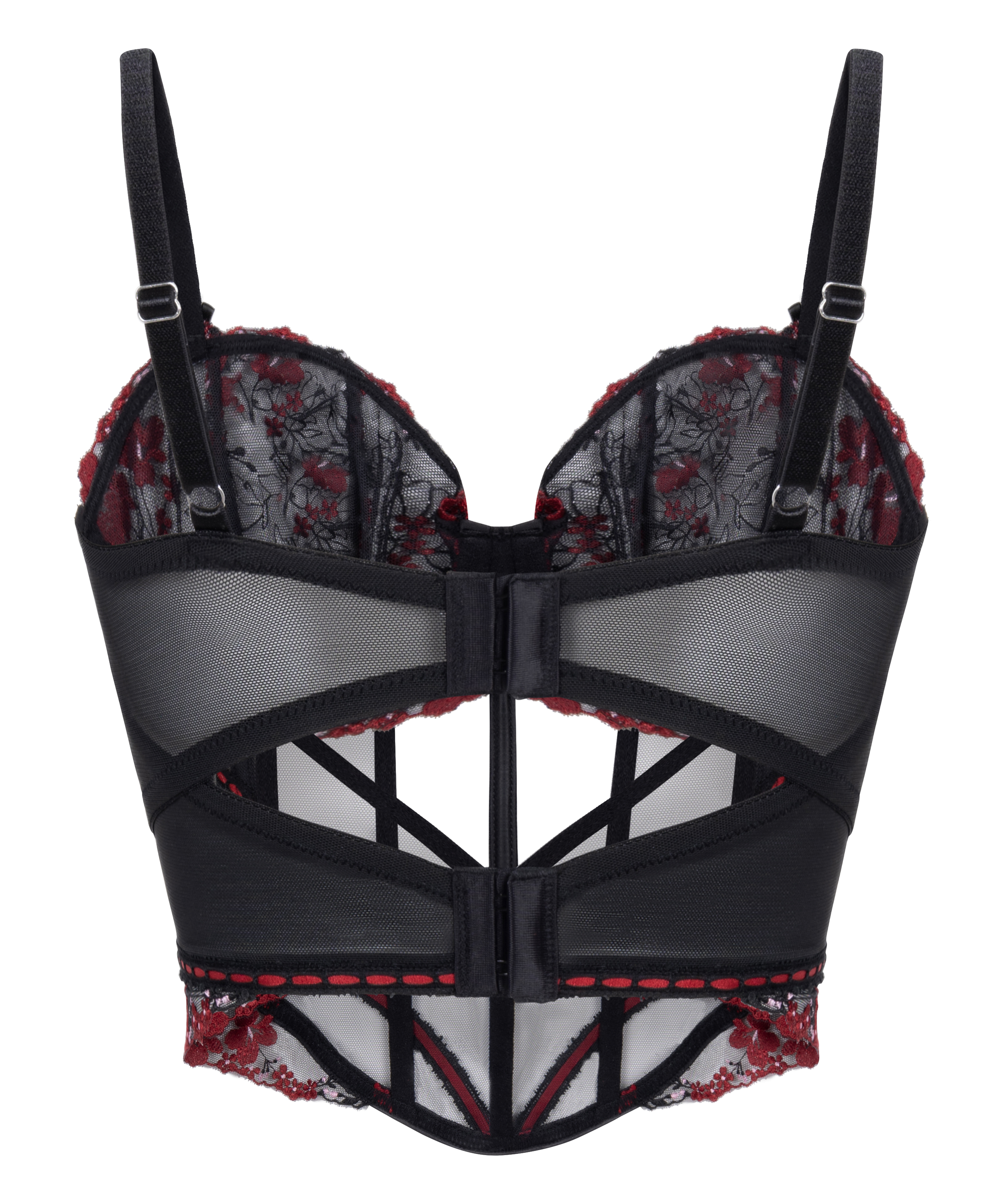 Giv et dristigt, men romantisk statement med denne strukturerede bustier i mesh, der har bøjlestøtte og ingen vattering for en naturlig silhuet. Udsmykket med fine blomster- og broderier med røde roser er den designet til at fremhæve dine kurver med elegance. Justerbare stropper sikrer en perfekt pasform, mens den skulpturelle form tilføjer et strejf af drama. Ideel til lag-på-lag eller alene for et selvsikkert og feminint look.