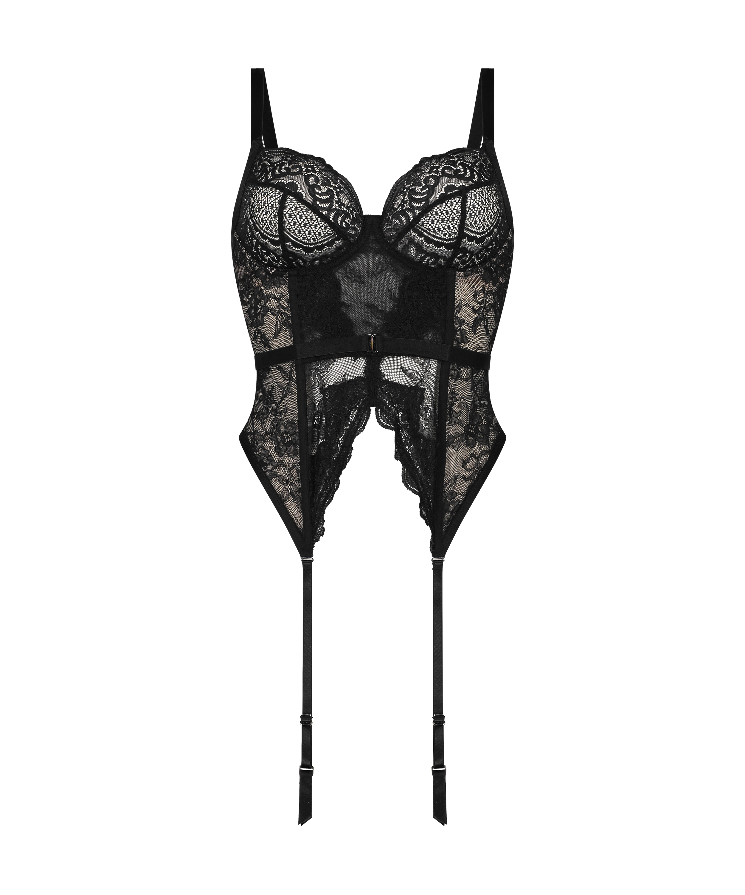 Skab et elegant look med det sexede bustier. Der er masser af gennemgående blonder og stivere foran for ekstra komfort. Den har også trikotagekroge, så du kan style den med dine favoritter. Fuldend looket med en kimono og trikotage.