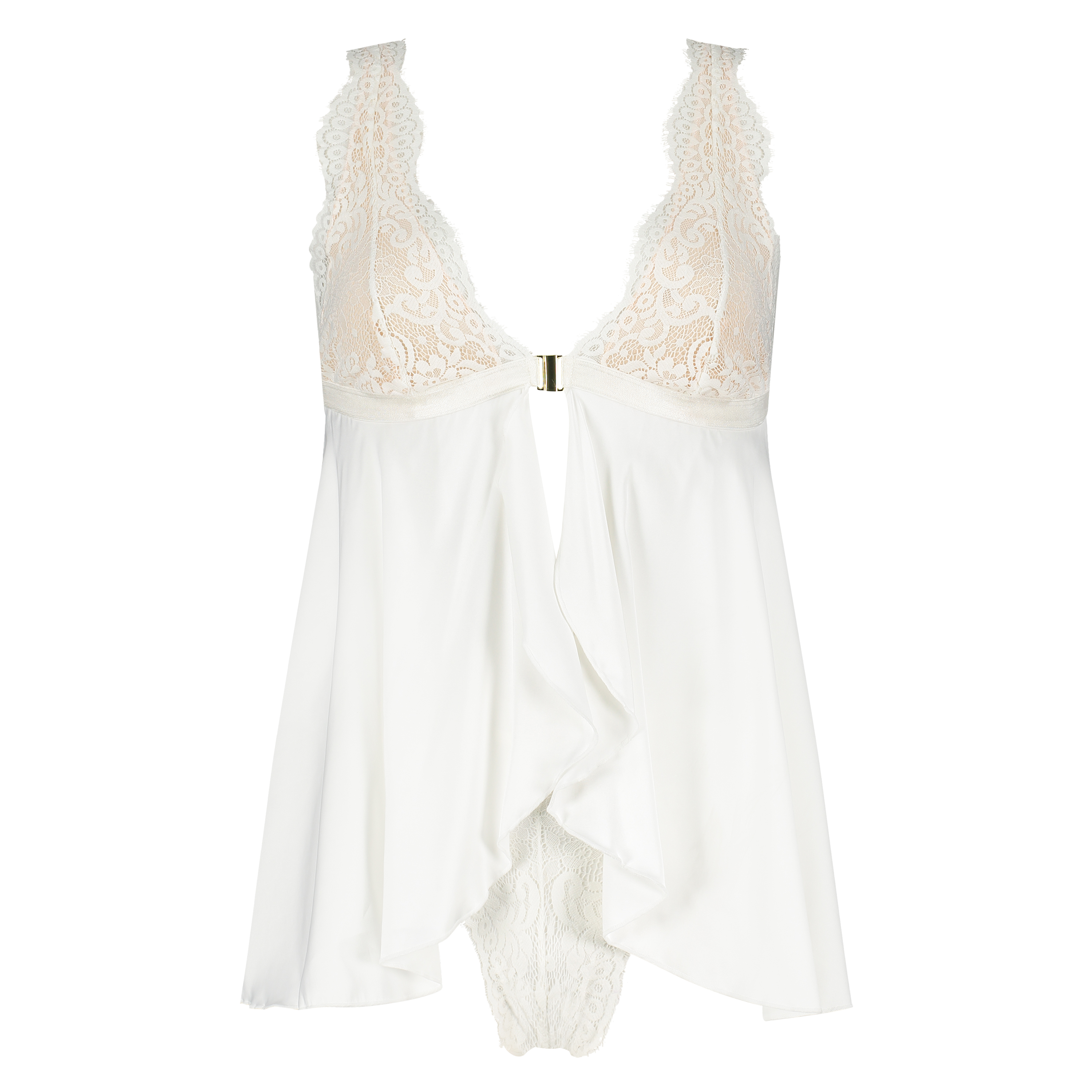 Dette camisæt klæder dig fantastisk! Sættet har et satin look-and-feel. Den er med lukning foran og en smuk blonde over skålene. Den tilhørende trusse er små shorts.