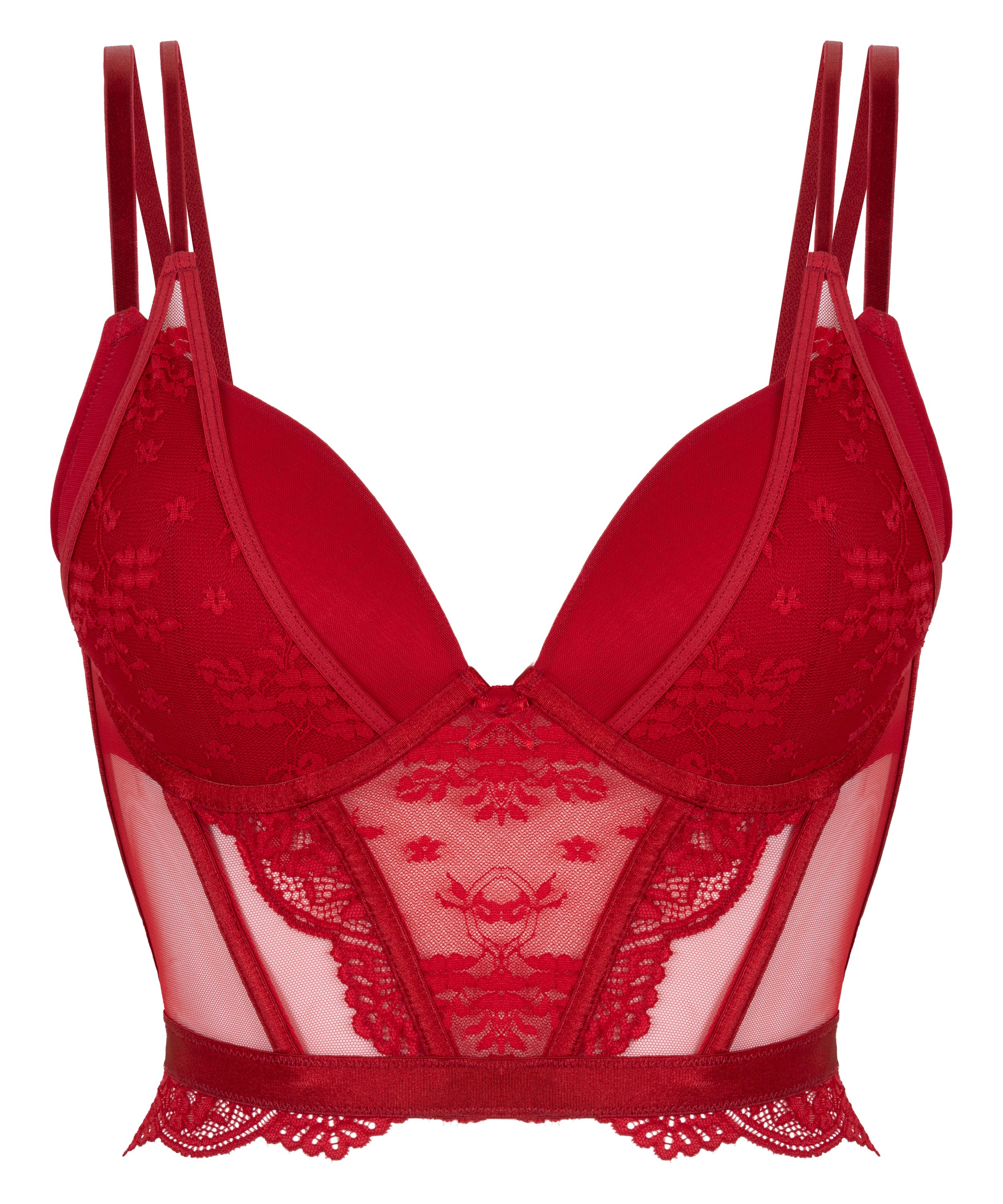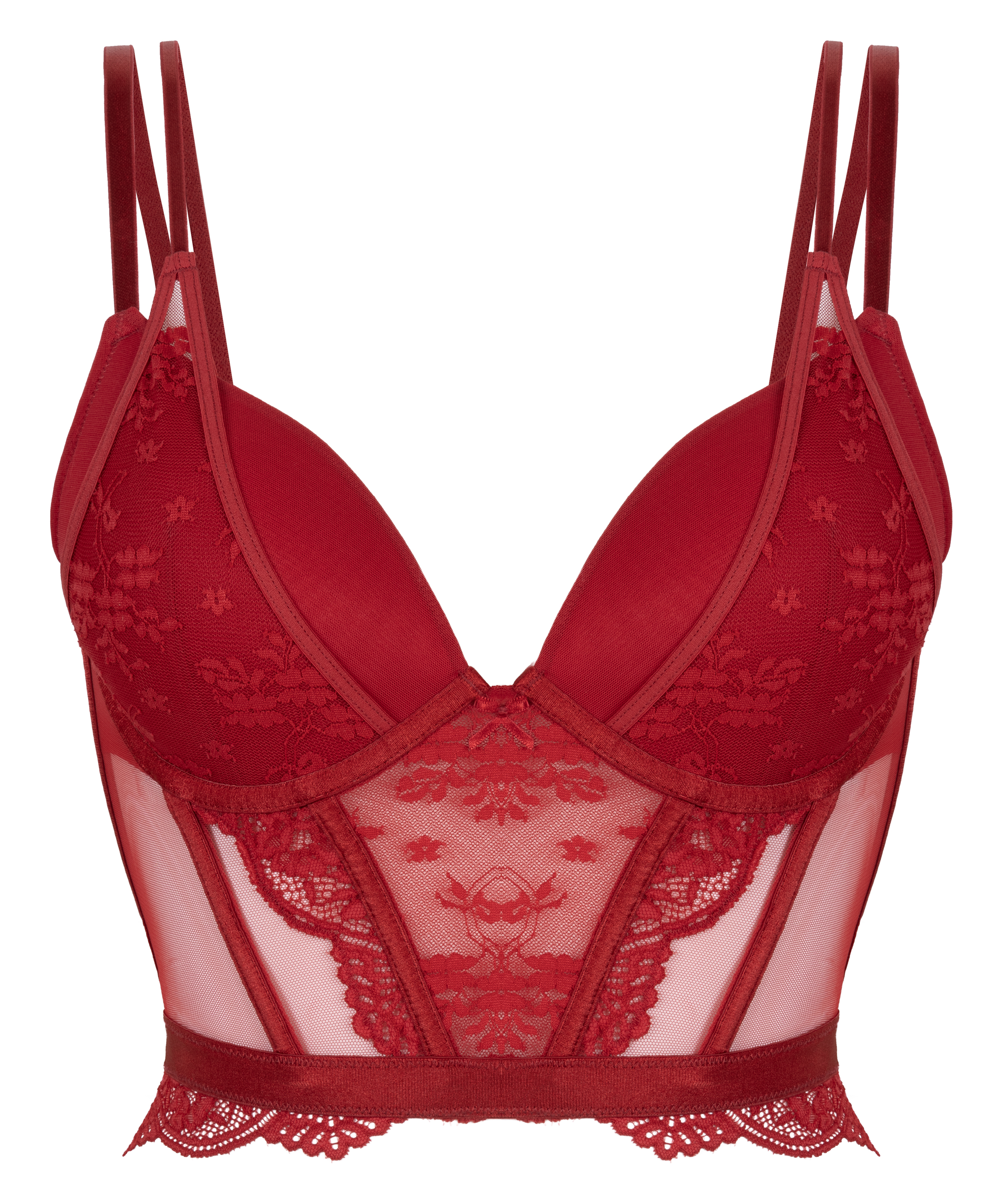 Forbedr dine kurver med vores bh, som er en perfekt kombination af elegance og støtte. Med polstrede push-up-skåle giver denne bh et flot løft, mens longline-silhuetten giver ekstra støtte og en slank, moderne pasform. Indviklede blondedetaljer tilføjer et romantisk touch, mens gennemsigtige mesh-paneler giver designet en dristig kant.
