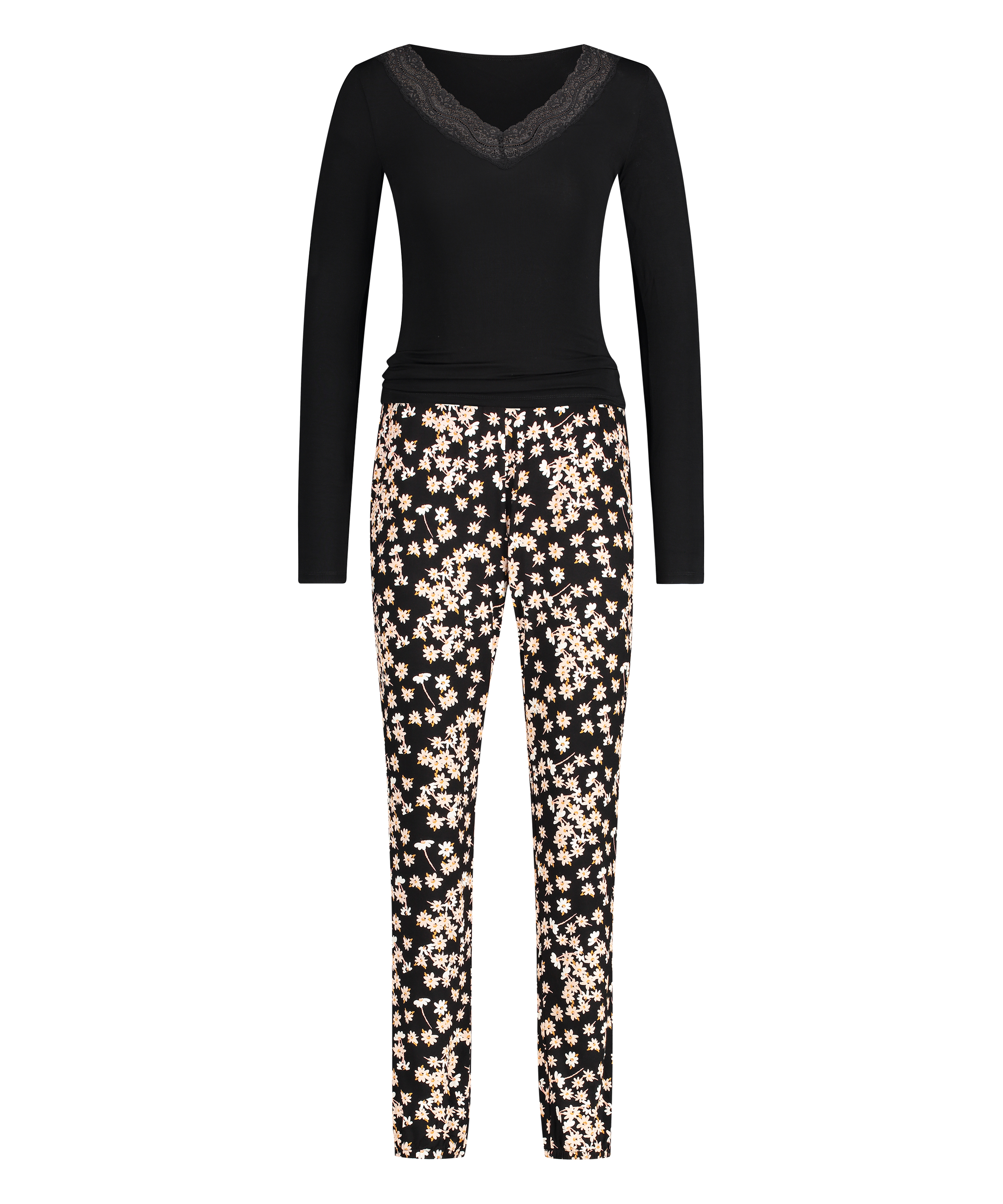 Få dejlige varme nætter i dette behagelige pyjamassæt! Toppen har blondedetaljer, og bukserne har et print.