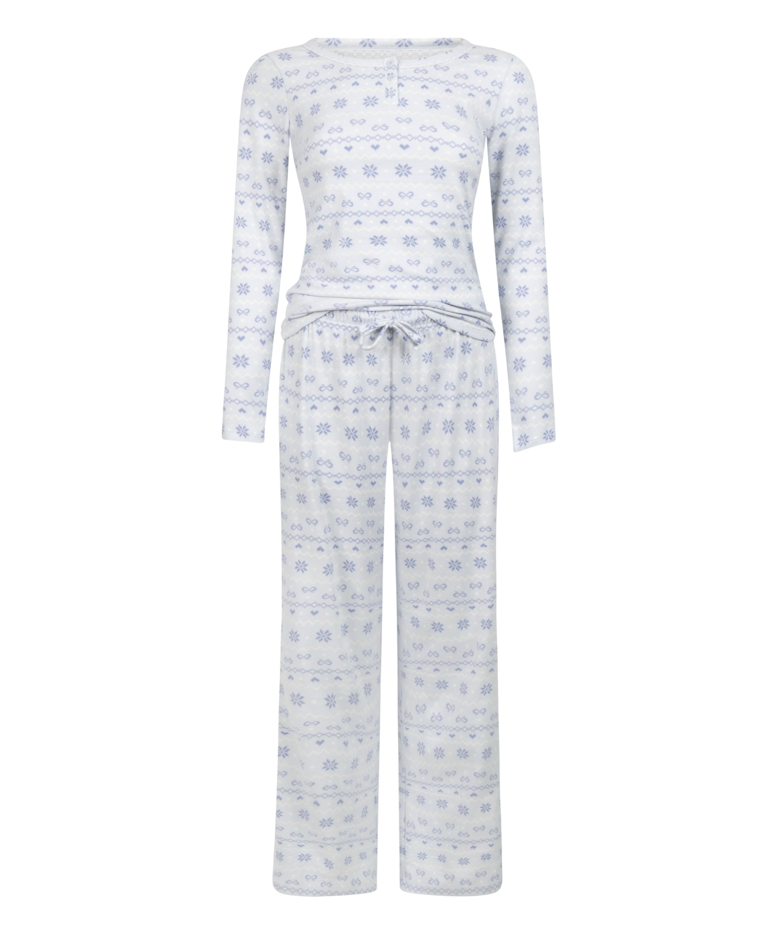 Pak dig ind i varme, hygge og charme med denne dejlige pyjamas, som passer perfekt til kølige aftener og festlige morgener. Denne pyjamas har en langærmet overdel og lange bukser, der begge er lavet af et blødt stof og designet til ultimativ komfort. Printet tilføjer et strejf af julestemning, hvilket gør det til et must-have til afslapning, en gaveidé eller blot til at omfavne sæsonen med stil.